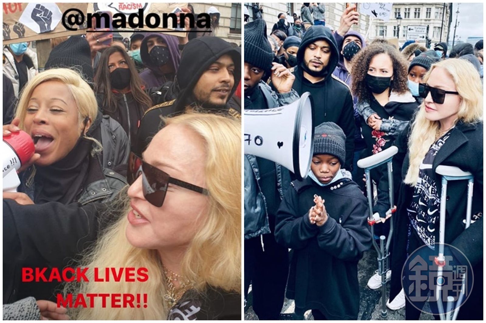 【非裔之死掀眾怒】瑪丹娜拄拐杖上街 現身倫敦挺黑人平權示威