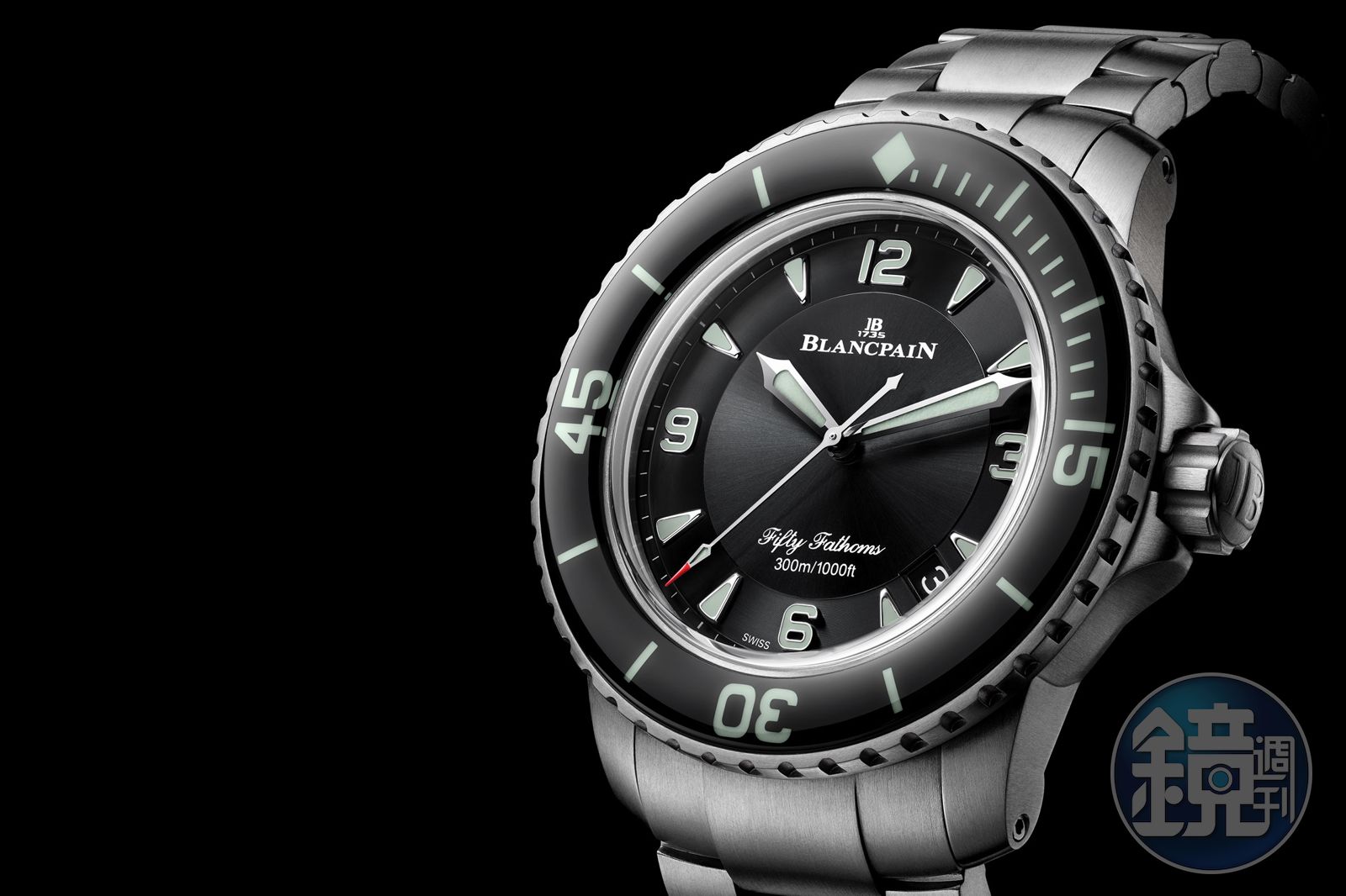 大日期視窗是寶珀經典功能之一,不過先前都放在斯文正裝錶上,直到2018年才首度延伸到五十噚系列上推出5050型號的作品,且換裝新一代6918B型自動上鏈機芯,由三個發條盒串連,讓動力儲存長達120小時。這次寶珀將5050腕錶改成全鈦金屬的版本,即便是45mm的大尺寸,配戴上仍舊舒適輕盈,同時錶款防水為300米,並有透明藍寶石水晶底蓋,定價NT$641,000。