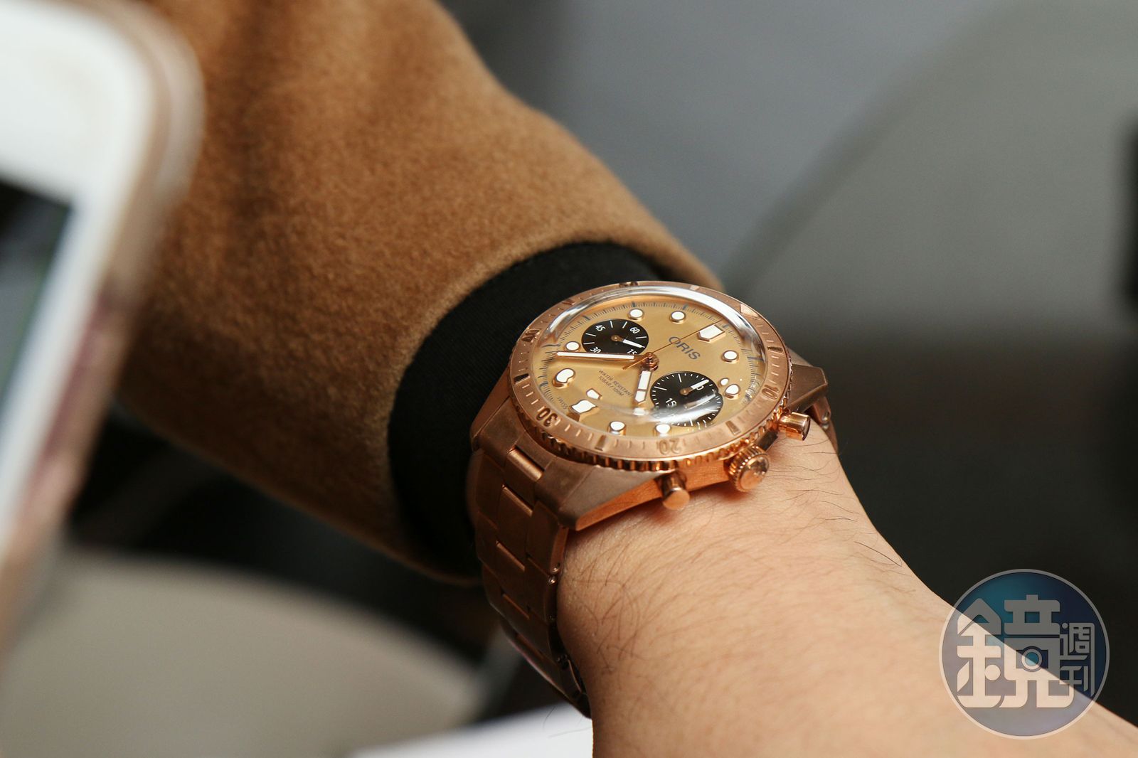 作為此主題系列的第一款作品,Hölstein 2020限量錶以Divers Sixty Five計時碼錶為基礎, Divers Sixty Five是以1960年代ORIS第一款潛水錶為靈感發想,圓點時標刻度、立體的拱型鏡面都承襲自當時的細節元素。Hölstein 2020限量錶使用青銅材質重新詮釋整枚作品,除了錶殼、錶圈以及面盤都是青銅材質之外,這更是瑞士製錶業中首創使用青銅材質錶帶的作品(部分部件像後底蓋、錶栓、折疊扣等,因使用條件為考量,仍然為不鏽鋼材質);青銅材質會根據使用習慣氧化出不同的銅綠,能夠養出屬於自己特色的腕錶,也正是玩家們著迷的地方。如今連錶帶都換成了青銅材質,會有其它品牌跟進嗎?