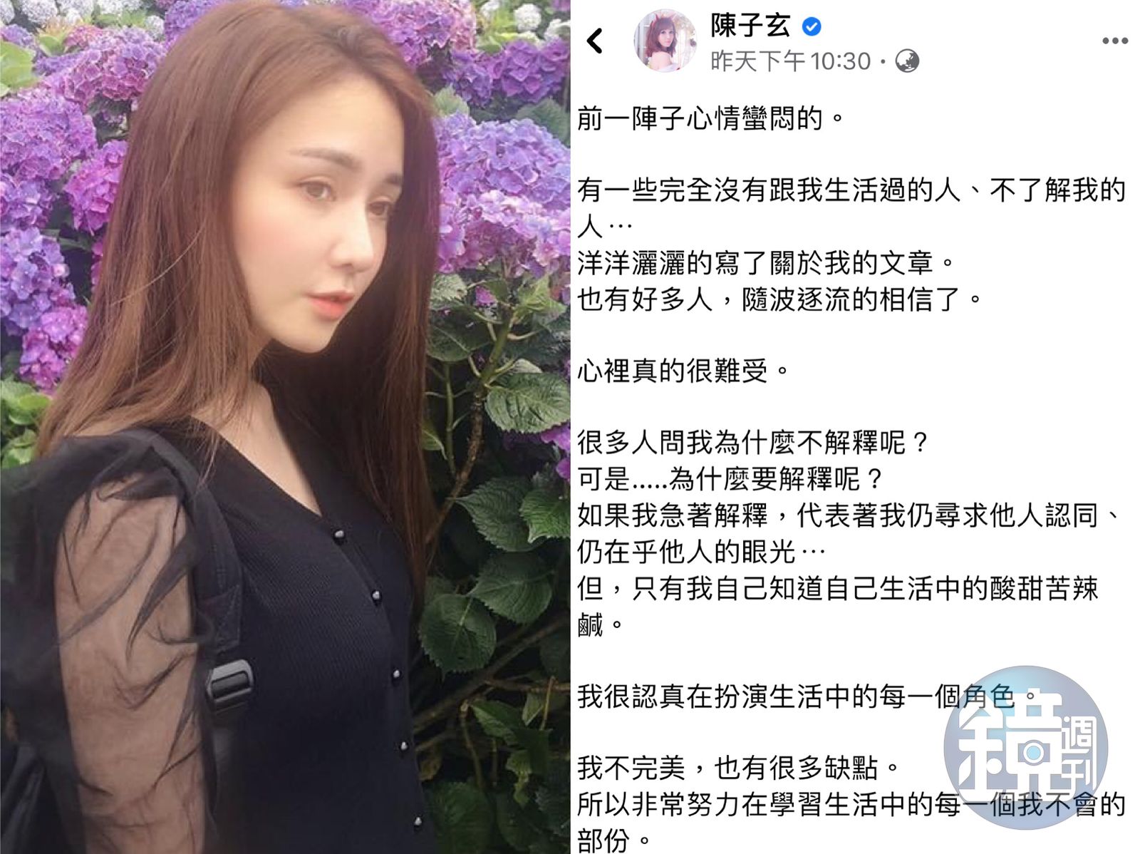 心情看來相當鬱悶的陳子玄透露自己對於外界的負面評論感到「心裡真的很難受」,認為只有自己知道自己生活中的酸甜苦辣鹹,不想藉此尋找他人的認同,「我很認真在扮演生活中的每一個角色。」 陳子玄覺得卸下演員角色後,自己就是爸媽的女兒、弟弟妹妹的姐姐、恩恩的媽媽,只是一個平凡人而已。她坦言自己是一個不完美的人,非常努力在學習生活中的每一個不會的部份,但大眾一直拿著放大鏡檢視著她,讓她直呼「好累」。許多網友看見陳子玄的真情告白,紛紛給予鼓勵與支持,也讓她心情平復許多,並向粉絲留言表達感謝。