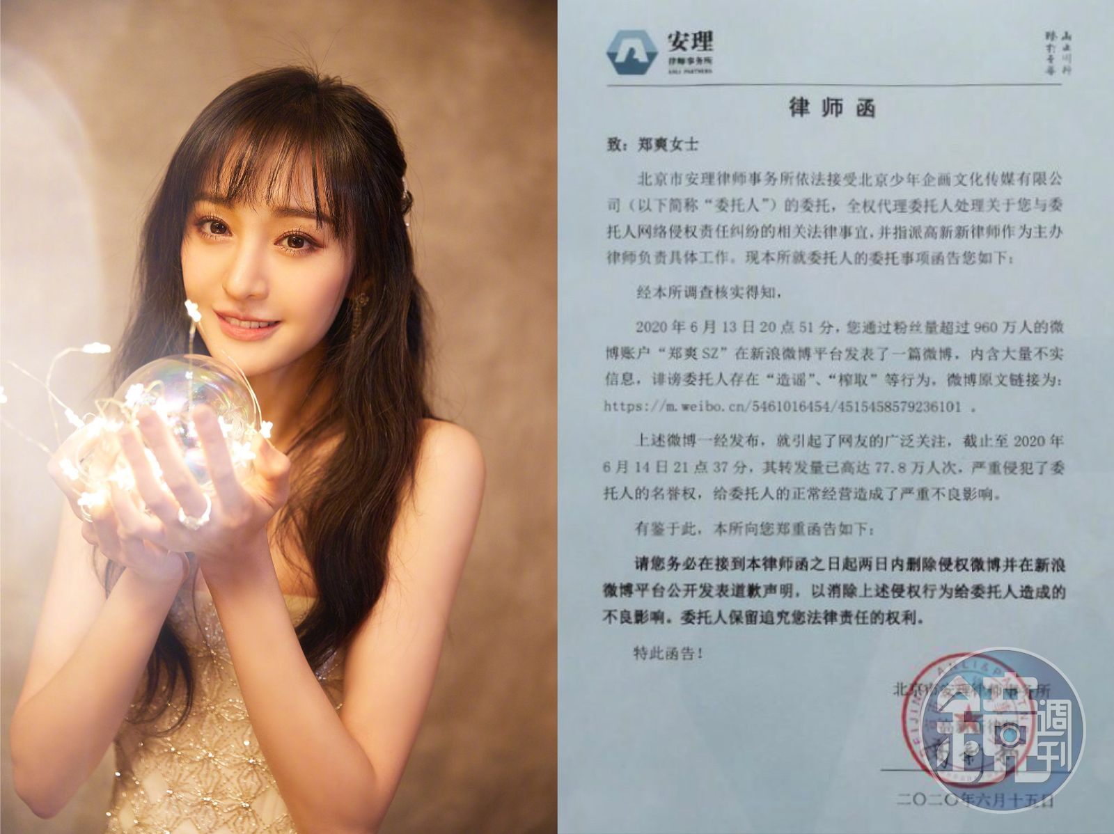 鄭爽前商務團隊「少年企畫」要求鄭爽2天之內刪除誹謗微博並公開道歉,並認為鄭爽顛倒黑白,考慮讓法律途徑來解決紛爭。 該團隊認為鄭爽發布內容含大量不實信息,不僅誹謗該團隊,並存在造謠、榨取等行為,嚴重侵犯了他們的名譽,要求鄭爽將內容刪除並公開道歉。但鄭爽第一時間卻直接回嗆:「我還在錄節目空閒看到這些,我沒時間,你們團隊現在是有多閒!」質疑前商務團隊早已策劃一切。