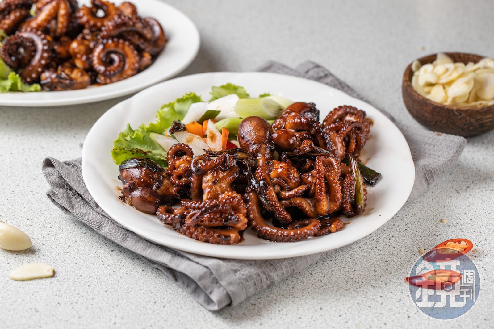 「澎湖蟹黃章魚」鮮甜會爆漿(前,2,000元/斤;圖中為1,000元/份,需預訂);鹹甘挺脆的「澎湖黑糖章魚」(後,380元/份)。發布時間:2020.10.20 19:01 臺北時間