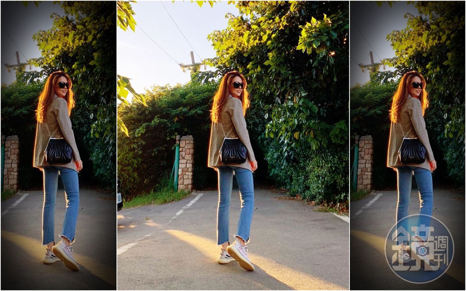 昆凌穿著格紋西裝外套搭配九分丹寧褲,黑色的復古感Degrade Matelassé是最搶鏡的配件。〈翻攝自昆凌IG〉發布時間:2020.06.18 16:29 臺北時間