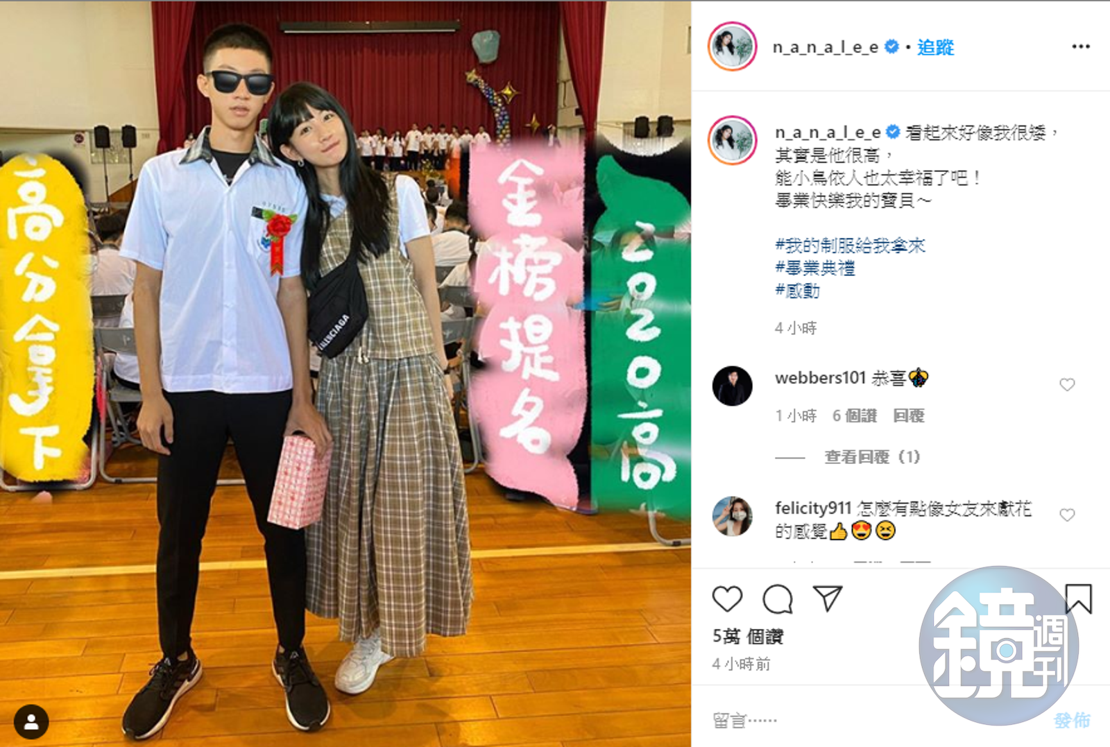 李千那與前夫生有1兒1女,去年女兒國中畢業,今年則參加兒子的畢業典禮。她穿著簡單的Tee恤與格子長裙,把頭靠在兒子肩膀上,兒子則戴上酷炫的墨鏡,李千那本身已有173公分,但兩人站在一起竟依然有著情侶身高差,她在照片上寫著「看起來好像我很矮,其實是他很高,能小鳥依人也太幸福了吧!畢業快樂我的寶貝~」有網友故意說「女同學,妳怎麼沒穿校服跟男同學一起拍畢業照?」她得意回:「我是她校外女友啦」。