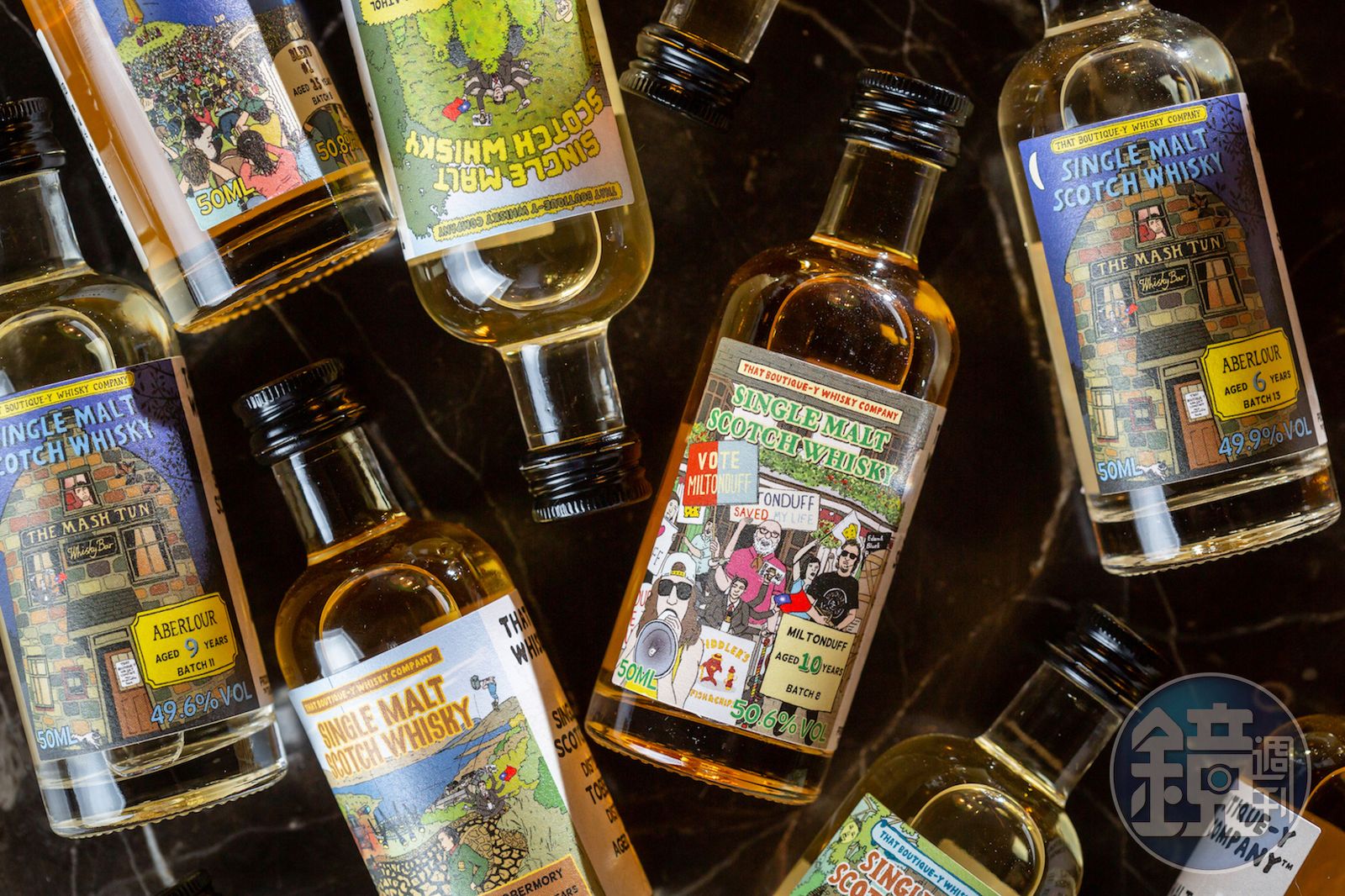 蘇格蘭獨立裝瓶廠「Murray McDavid」擅長過桶陳年,產品分為6大系列。(1,500元~16,000元/瓶) 德國獨立裝瓶廠「Sansibar」選酒獨到,其中亦與酒如坊合作選桶裝瓶,以戲曲人物為酒標。(3,300元~15,000元/瓶) 來「酒如坊」實體店面可透過品酒介紹更了解獨立裝瓶廠。 搜羅各家威士忌,重新包裝,這些獨立裝瓶廠打破品牌迷思,以風味、感官作疆界,回歸喝酒的自由,並提供進階玩家另一種選擇,偶而還驚喜發現一些連原廠都沒有、已關廠或老年份的酒。其中,我最感興趣的,就是眼前這30多款如漫畫般的詼諧酒標,竟有青天白日滿地紅藏在瓶身飄揚。