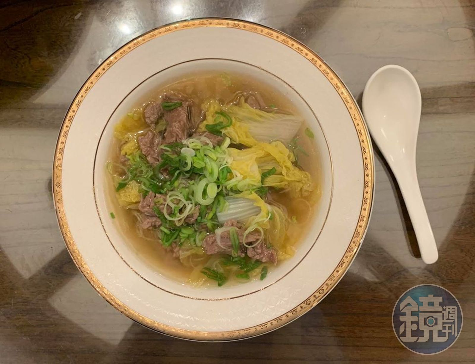 切記,牛肉要一條一條入湯,不要一整球丟進去,免得結在一起。在起鍋前,加上青蒜末,完成最後的提味。是謂明福版的牛肉羹。