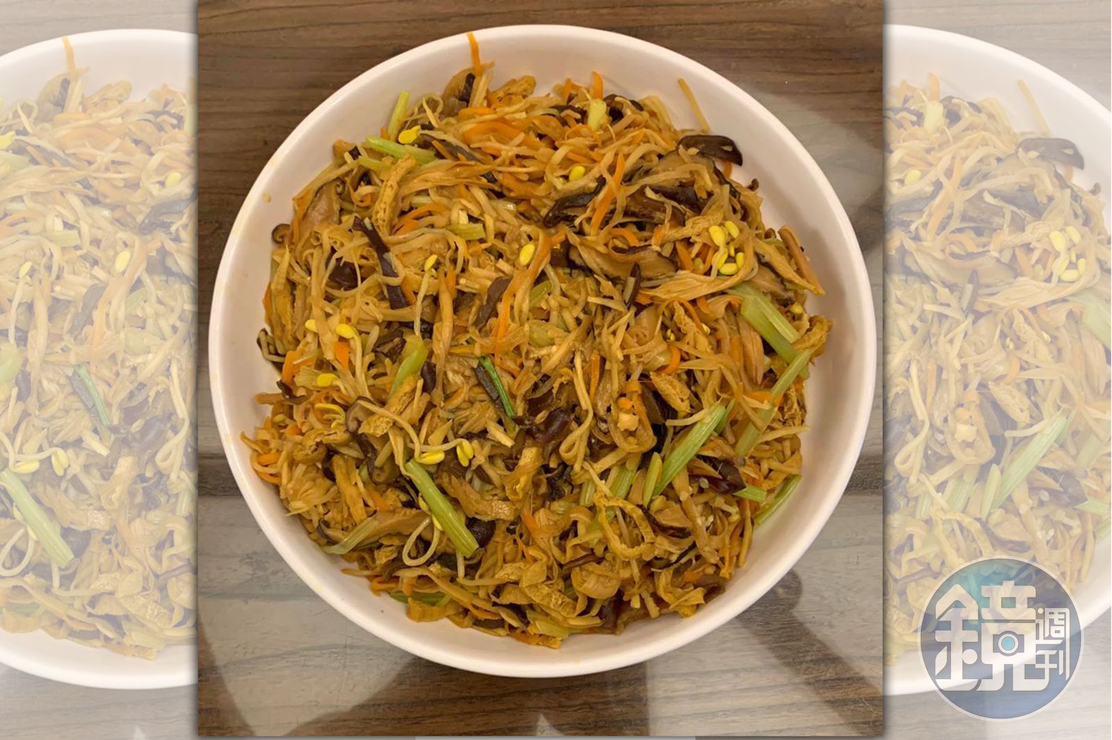 Step1:香菇泡水發好切絲,泡香菇的水留著,金針花泡水瀝乾,水不留。豆皮先炸過後切絲。冬筍、紅蘿蔔、地梨切絲備用,白背黑木耳、芹菜切絲,黃豆芽過熱水。(若為什錦菜,則將塔鴣菜順著剝去掉葉背的脈)