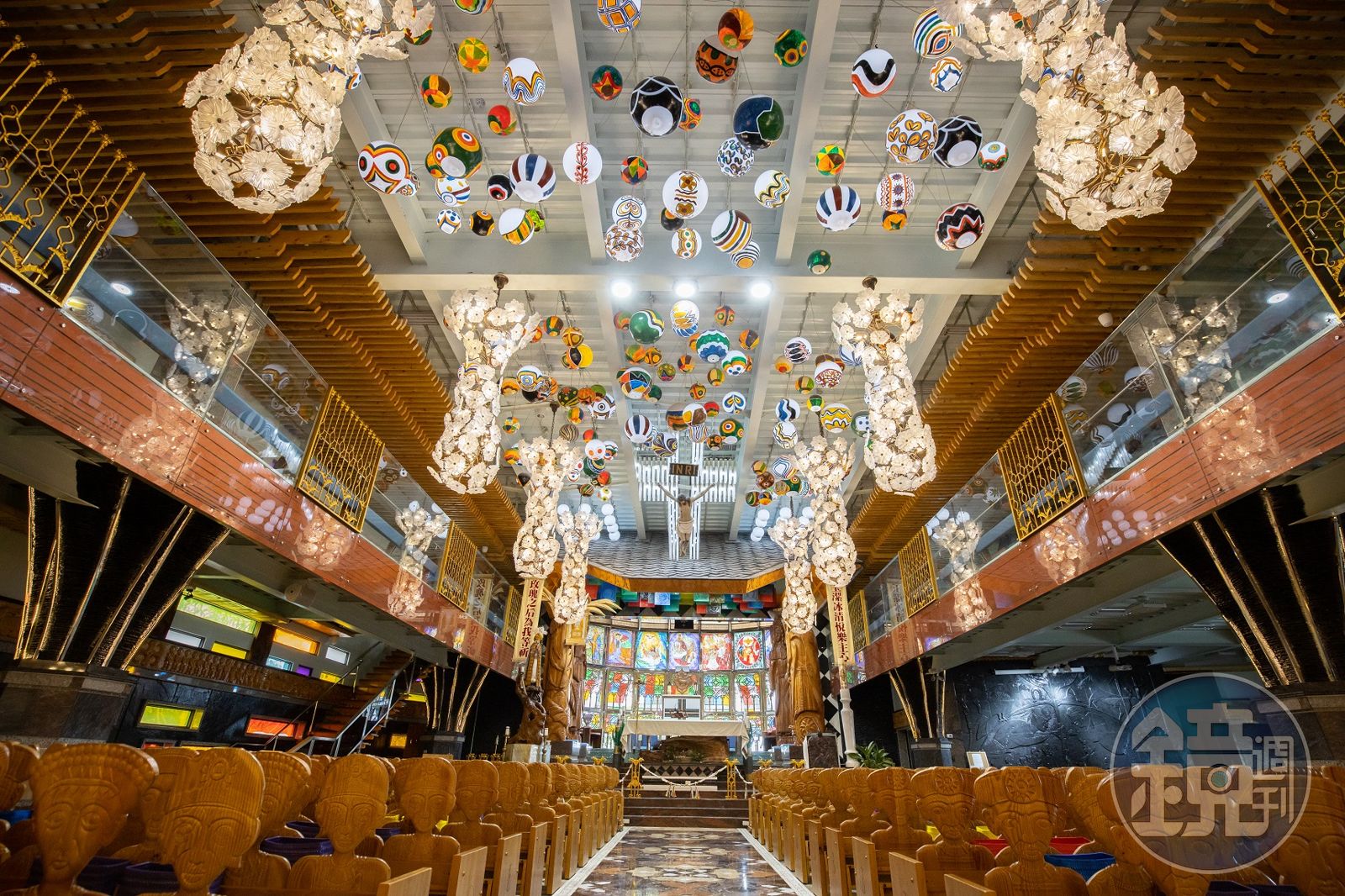 不僅如此,往下看教堂地板的圖騰,運用了排灣族服飾常用的花樣圖案,抬頭仰望,8盞由多朵玻璃花燈組成的華麗花燈、向下垂如花束,搭配排灣族有名的7彩琉璃珠點綴,加上以馬克玻璃描繪天主教7件聖事的炫麗祭壇,以及帶有原民風格的天使像,無數精彩細節,構成了富麗莊嚴又充滿原住民美學的聖母堂印象。