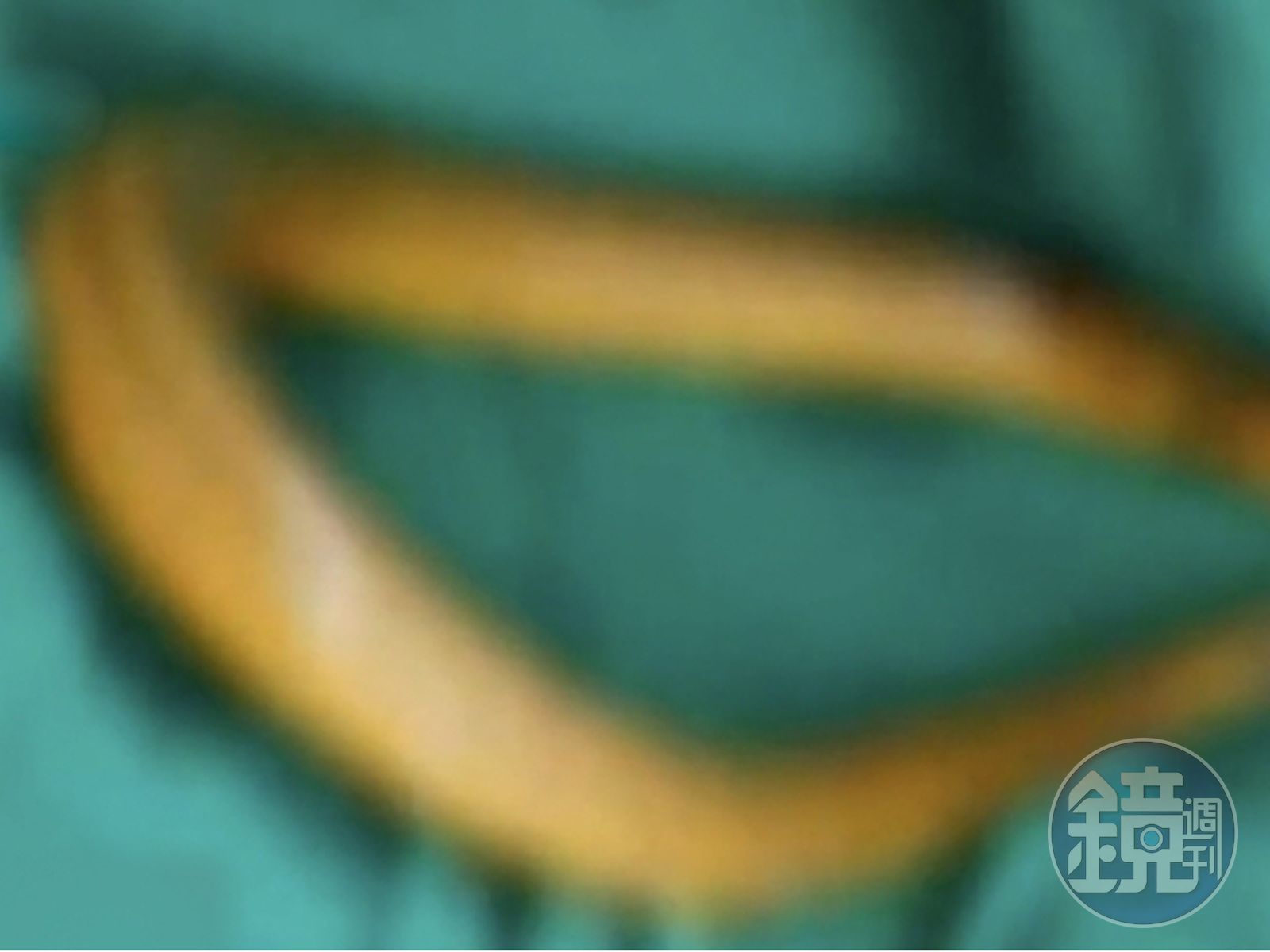 隨著時間慢慢過去,該名男子已經無法與人正常溝通,醫師趕緊進行腹腔鏡檢查,判斷為消化道穿孔,而就在檢查過程中,醫師發現男子腹部中的異物竟然是一條40公分長的黃鱔。