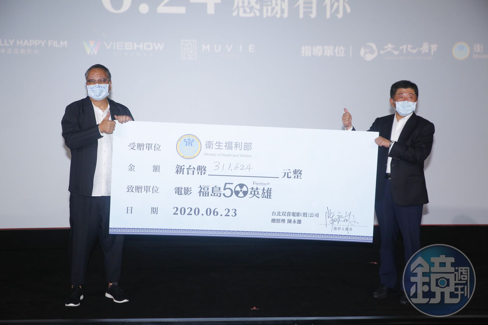 經衛福部陳時中部長提醒,双喜電影總經理陳永雄阿莎力立刻拿筆在支票簽下大名。《福島50英雄》取材自日本311核災事件,日本福島第一核電廠的50位員工,為守護家園,冒死待在核電廠,防止核洩危機。在如今疫情減緩下,片商也邀請衛福部陳時中部長,率領「防疫五月天」成員在內的長官們觀影,帶動觀眾端午節連假起能安心看電影。