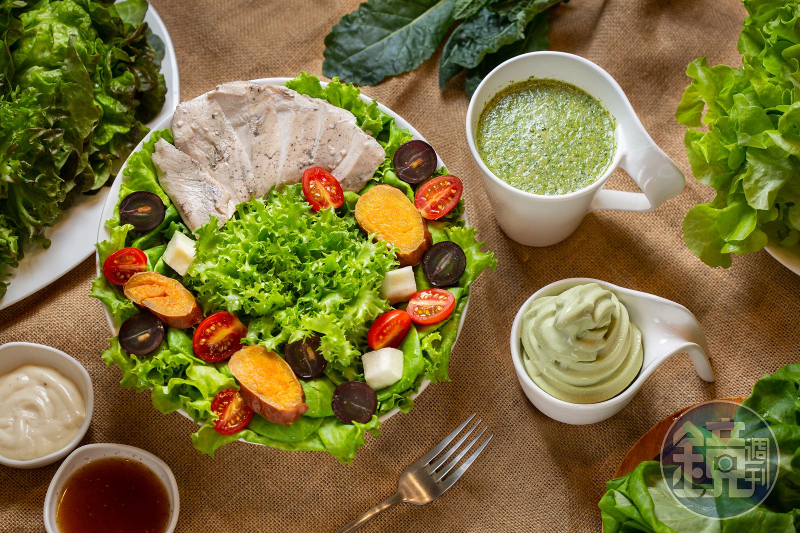 最近開封即食的舒肥雞胸肉正夯,他們也從善如流加進生菜沙拉裡,來自鹽水的CAS雞胸,變出義式香草、花椒、蒜味胡椒、玫瑰鹽四種口味,醬汁也有和風、凱薩可選擇,前者有橙醋鮮酸,後者嘗得到鯷魚香,誠意十足。餐飲經理李懿麗說:「我們還加了台農57號冰烤地瓜,對健身族來說,這就是很好的一餐。我們也強調『只要洗手不用洗菜』,因為我們的生菜殘菌數都遠低於法規標準,甚至比飲用水還乾淨。」
