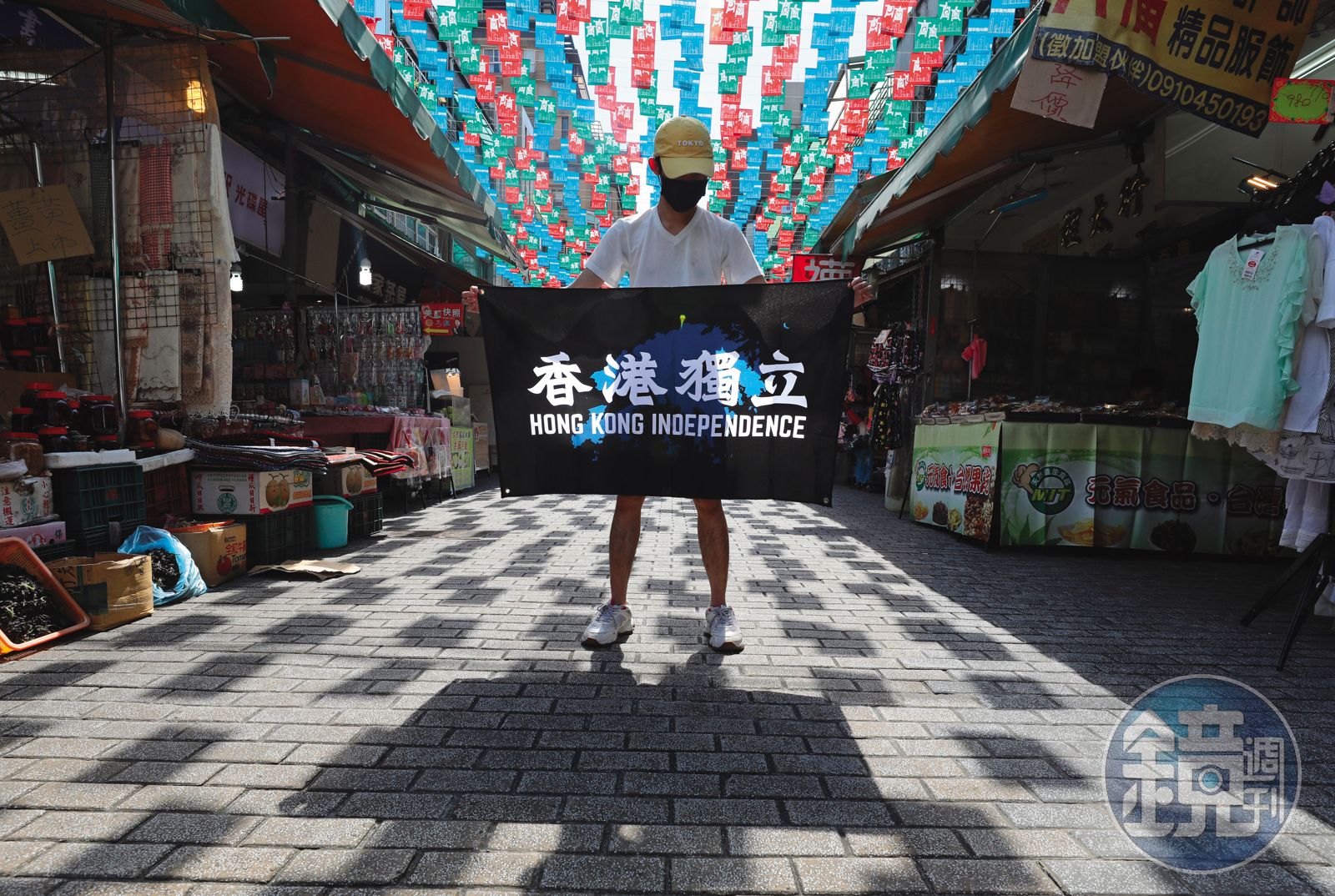 採訪前,我們先帶著約克(化名)到台北中山區四平街上拍照。剛考完試,他顯然很放鬆,連蒙面的道具都沒有準備,僅口罩一枚。但拿出港獨旗攤開時,他還是找了個角度,讓帽簷遮住他的臉。此時一名路人大嬸從旁邊竄出,觀察了幾秒,忽然用台語出聲問:「恁是台灣人嗎?」