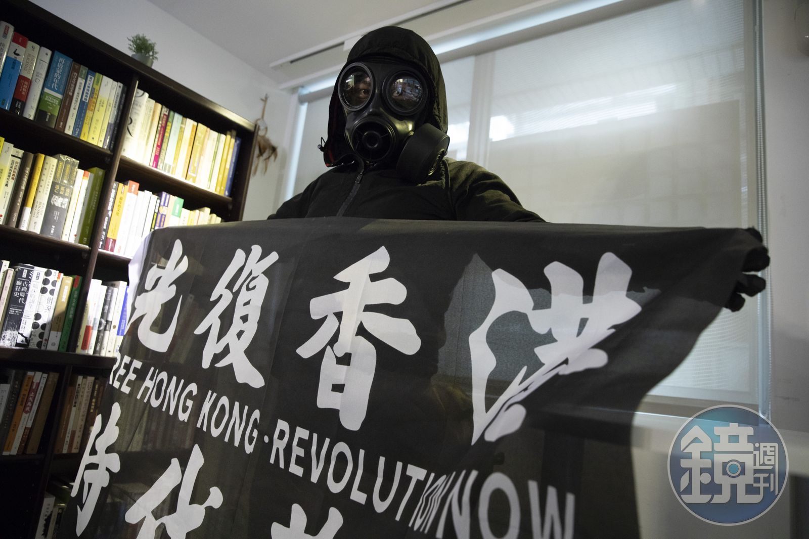 小鐵(化名)在書店接受我們採訪,一身簡便黑衣,趁著架攝影機的空檔,拿出他在軍用品店買的墨綠色面巾圍上,把大半張臉都遮住。他中文不錯,偶爾夾雜幾句台式國罵,問他為什麼中文這麼好?他說:「我2018年時就開始和台灣的人打線上遊戲,所以中文比較好。」其中一款遊戲叫「戰地風雲」的遊戲從二代打到四代,也從虛擬打到現實,他成了總在前線抗爭的勇武派。