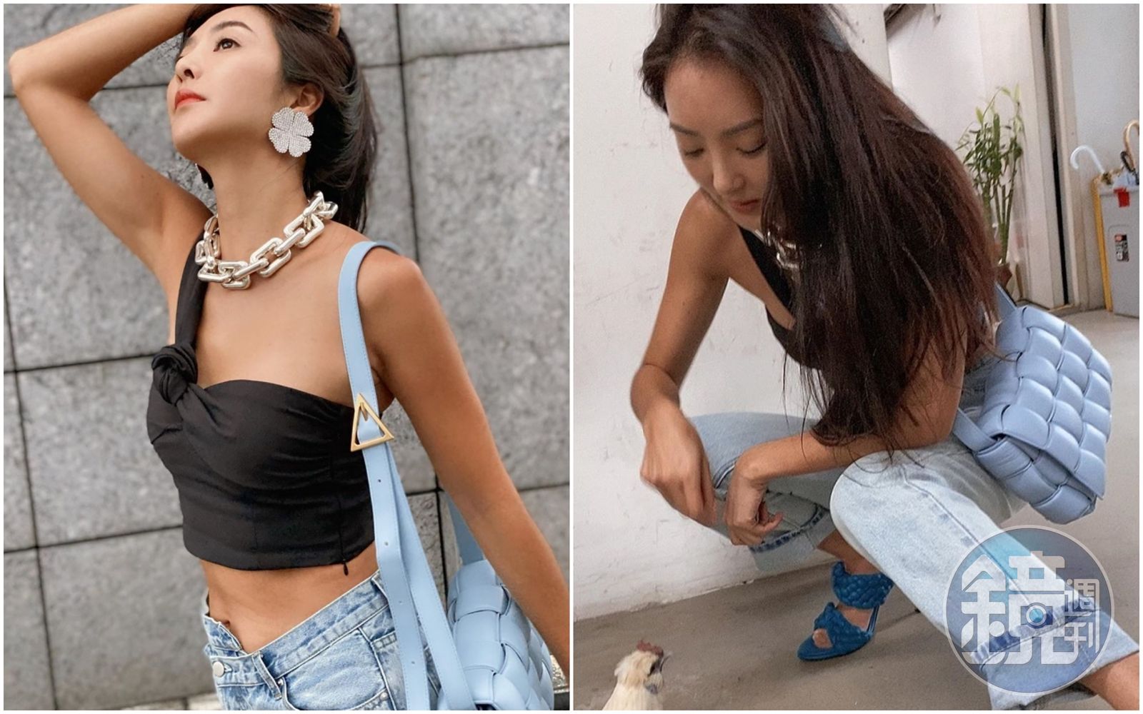 這麼熱的天氣,如果你再揹一個基本色系的黑色包款出門,完全是增高自己溫度,也讓旁人暑熱難耐啊!歌手曹格愛妻吳速玲,經常在網路上分享自己穿搭與生活點滴,日前她po出身著短版上衣搭配丹寧褲的輕鬆穿搭,一咖粉藍色BOTTEGA VENETA(簡稱BV)的編織小羊皮肩背包非常醒目,誇張的格紋效果更讓人有放鬆心情let it go的閒適感。