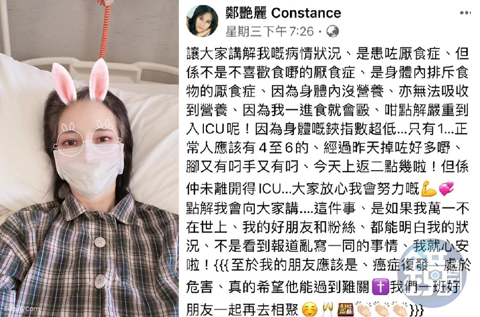年近半百的鄭艷麗這個月中突然在臉書自曝近況,似乎是過度憂鬱,開始產生厭食症狀,吃什麼吐什麼,身高165公分公分的她,體重剩下40公斤出頭,也開始因為營養不良產生暈眩。上週2時,鄭艷麗更嚴重到送醫住進加護病房,雖然她強調自己的厭食症並非不想吃東西,而是身體對食物排斥,但還是讓不少親友感到擔心。