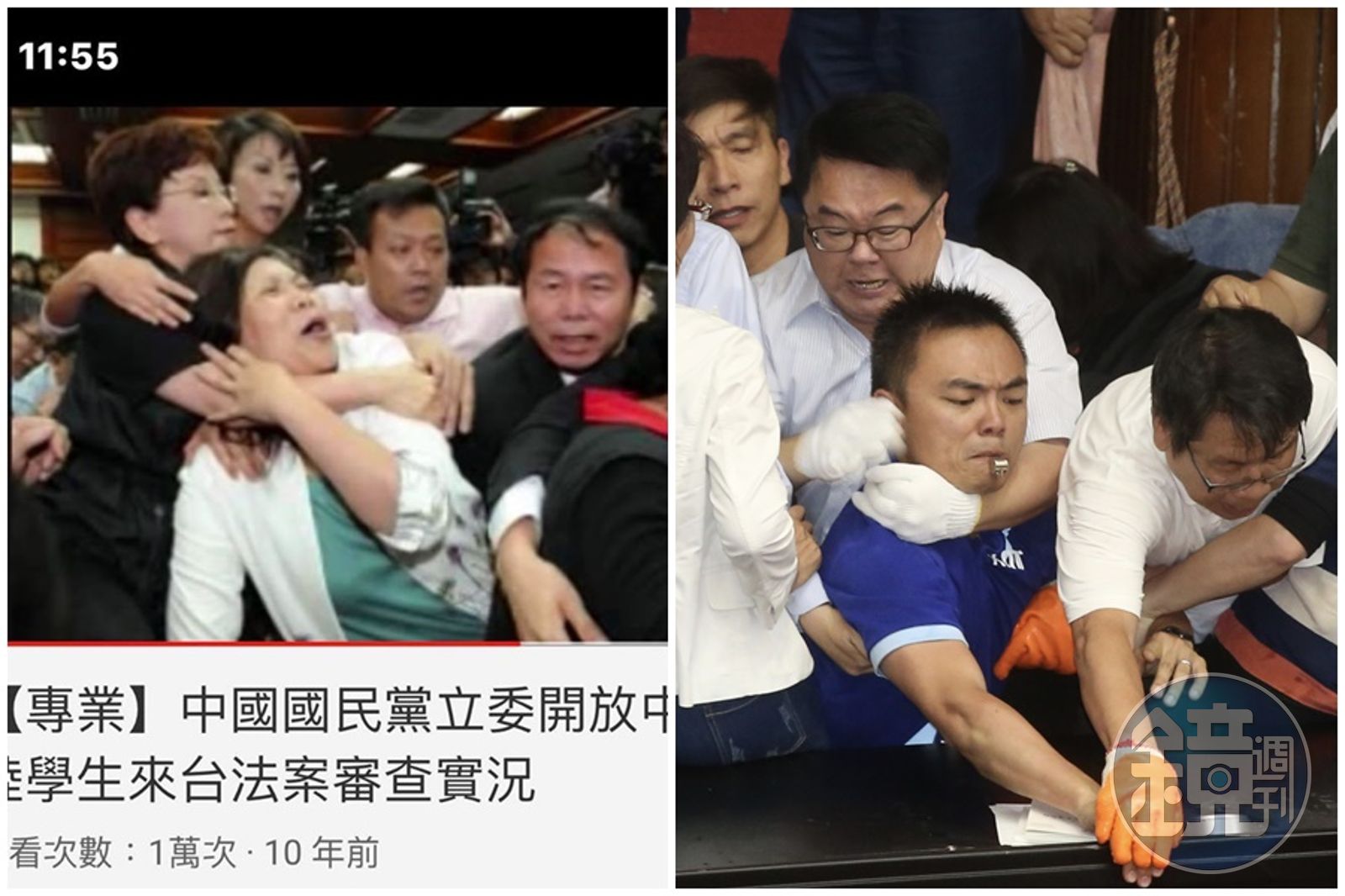 議場攻防常見到肢體衝突,管碧玲昨在臉書上PO出10年前,國民黨立委開放中國學生來台法案審查時,兩黨的肢體衝突照片,管碧玲被洪秀柱從後面勒住脖子,管碧玲伸手想要制止,表情痛苦。
