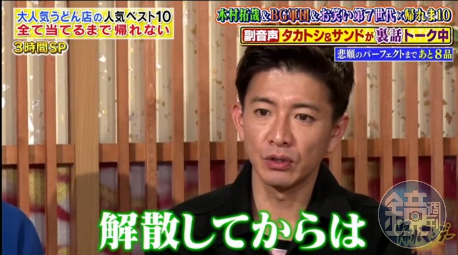 SMAP解散後,木村將工作重心放在戲劇上,直到今年初才找來音樂界好友製作了入行來首張個人專輯,更在二月舉辦個唱。昨在節目中,他鬆口坦言團體解散後就沒想過重返舞台,雖周圍有人提議,但一直找藉口呼嚨了過去,透露出當時的複雜心情。