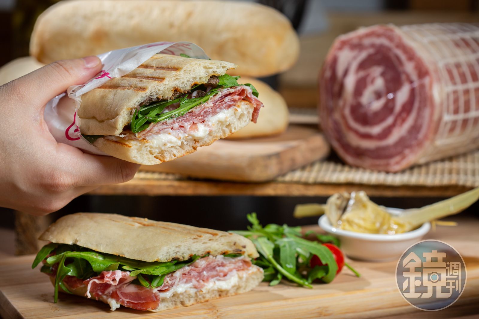 「冷切肉盤&乳酪盤」(880元/中份)附6至7款肉品,不定期更換,這次我吃到少見的煙燻培根。起司搭著「松露蜂蜜」(左上,780元/罐)一起吃,堆疊出甜滋滋奶香。「薄餅帕尼尼」捲進Porchetta、水牛莫札瑞拉起司,配著芝麻葉,是充滿義式風情的小食。(280元/份)「布拉塔佐開心果臘腸(醬)」用臘腸蘸起司,風味更上一層。(580元/份,附佛卡夏麵包)這裡不僅是義大利食材專賣店,也供應義式家常美食,現點現做的帕尼尼,就有火腿、臘腸、培根多種肉品可選;用些許臘腸、風乾硬質火腿、佛卡夏麵包粉、西班牙紅椒粉、番茄醬汁自製而成的義式手工肉丸也推出冷凍包裝,買回家微波幾分鐘就能上桌。