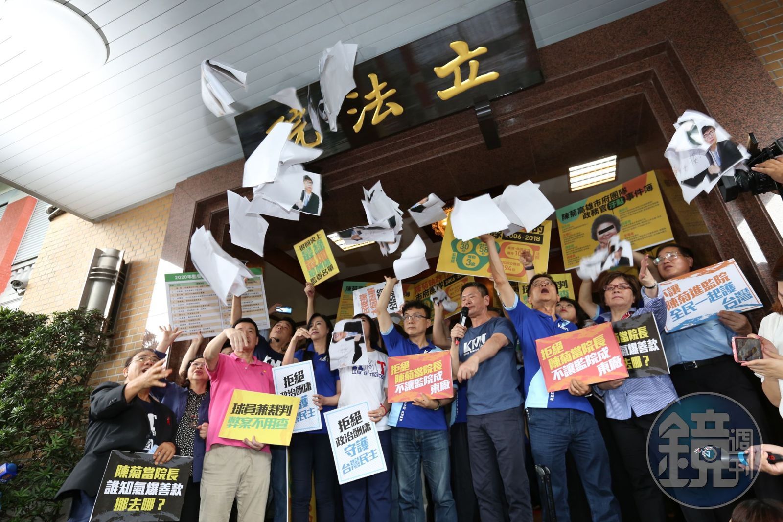 國民黨立委高舉抗議標語,林為洲痛批:「走了一個陳師孟,卻來了更多陳師孟!」他還引用民進黨高雄市長補選候選人陳其邁擔任立委時批評監委是「姦痿」,指監察院應該廢掉。藍委還高喊「廢監委、滅東廠、撤提名」等口號。