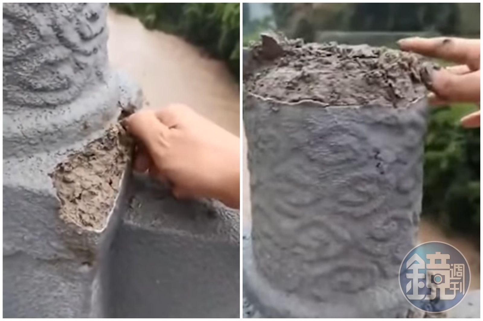 中國多地受到持續性暴雨影響,在重慶有座大橋,橋上石柱受到雨水浸泡,路人徒手捏石柱,上面的水泥竟然瞬間掉落。一名男子錄製影片並在片中質疑工程可能「偷工減料」,而影片一出,讓網友驚呼這根本是「手撕大橋」。 針對此事,重慶市石柱縣交通局則證實影片內容屬實,並指該座橋梁為涼水井大橋,於2017年12月開工,2019年8月完工,橋梁全長107米。石柱縣交通局也稱,該座大橋尚未驗收交工屬在建工程,目前已成立調查組核查,確認是否有安全問題。