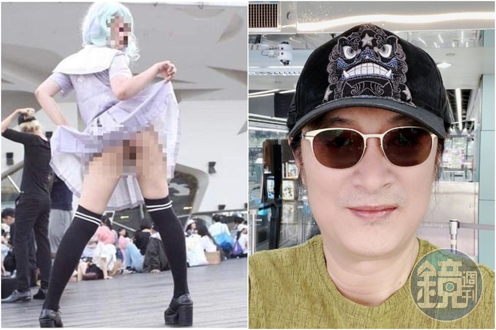 女大生沒穿內褲在動漫展掀起裙子任人拍攝,事後稱「就是在做自己」。(翻攝自黃安微博)黃安表示,自己最討厭的一句話,是源自90年代台灣的一個口香糖廣告詞:「只要我喜歡,有什麽不可以。」這句廣告詞扭曲了台灣一代年輕人價值觀,他反問,「只要你喜歡,真的什麽事都可以做嗎?」