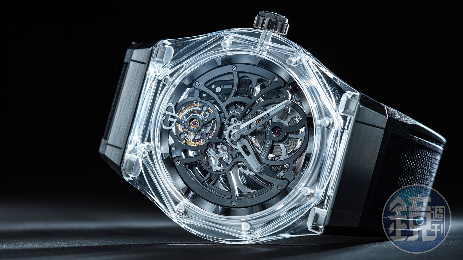 不只在視覺上很通透,Laureato Absolute Light在重量上也一併做了減量,錶耳和錶冠的部分用了鈦金屬,因此不只是看上去很透、戴上手也很輕,搭配的還是織紋面的橡膠錶帶,整體來說意象貫徹得很一致。另外還有一個亮點是在它的錶背,底蓋像是錶圈的拓印一樣,移植了八角形的形狀,八顆螺絲巧妙形成裝飾,全新GP01800鏤空機芯的自動盤也做得很別緻,弧形交錯的設計讓鏤空跳脫單純挖空的作法,將鏤空自動盤做得既有變化又很具現代感。