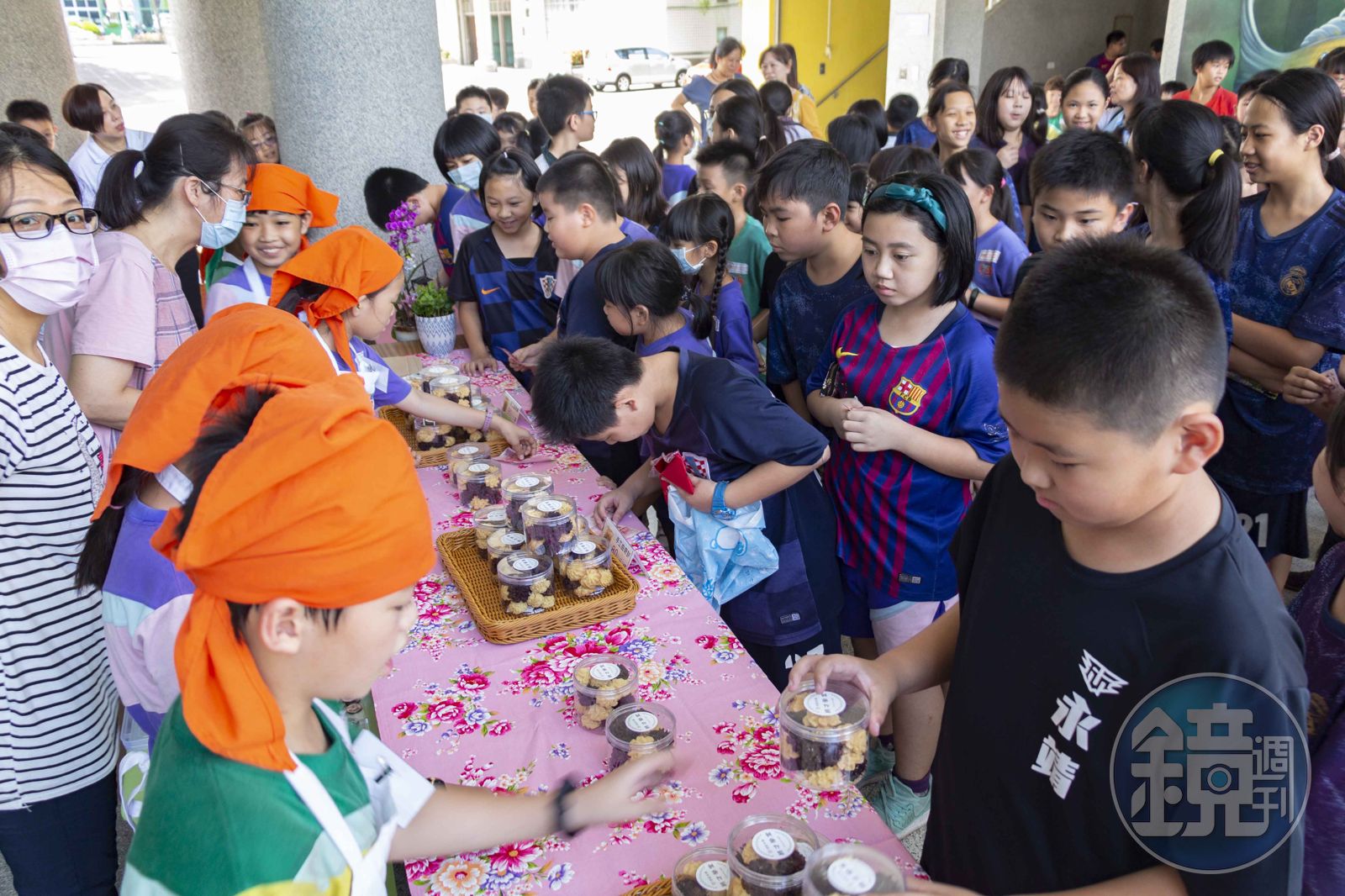 烘焙班的結業式暨愛心義賣活動今天在永靖國小登場,永靖國小教務處主任謝慶家帶領孩子們義賣手工餅乾,活動才剛開始,學校穿堂擠滿超過百位學生,開賣不到3分鐘瞬間秒殺,沒買到的同學紛紛大嘆好可惜,希望以後有機會能再買到!