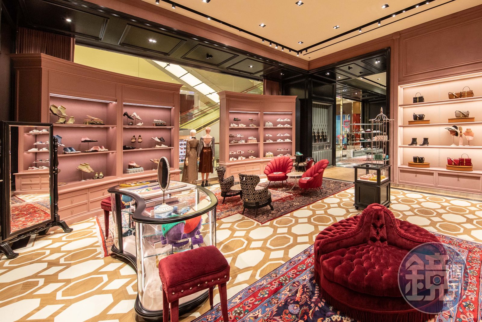 全新設計的外牆面以最新一季的視覺形象覆以大理石材質,彰顯摩登現代的風格,室內空間採用含蓄內斂的設計理念:天鵝絨扶手椅的柔和元素,與冷調個性的鉚釘工業風格帶來衝突的意象,精緻而獨特的材質則打造出當代奢華感。GUCCI全新品牌方向呈現優雅和兼容並蓄的風格,全新店鋪設計結合傳統與現代,並融合工業風與浪漫主義。