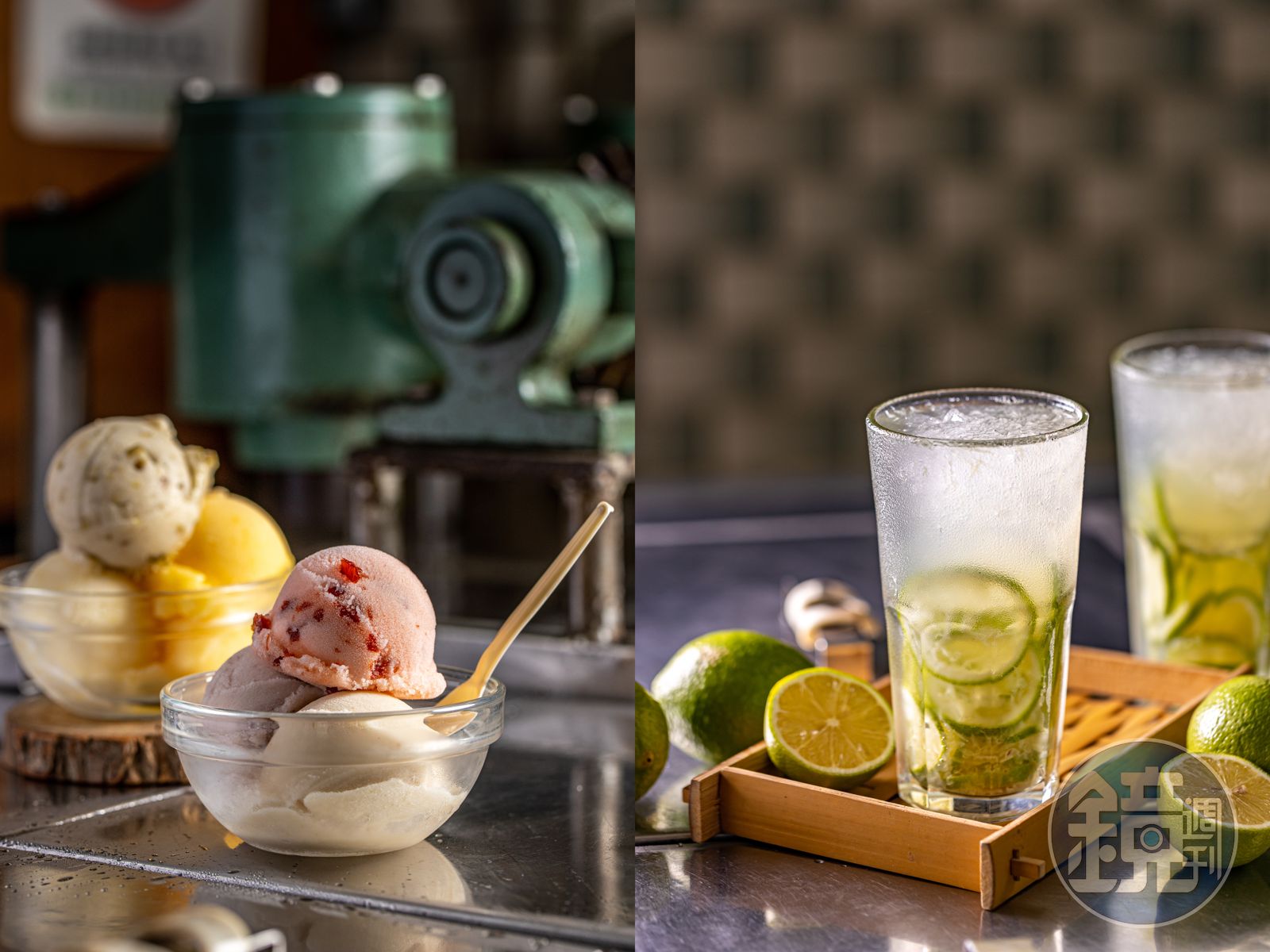 這兒的店招低調,真正的門面是不鏽鋼的上開冰櫃,搭上豆綠色瓷磚和蛇紋石地板,還有溫潤的黑漆木桌,彷彿凍結了老時代的美好。「以前這裡就是龍潭的迪化街,熱鬧極了,年輕人都在這裡吃冰約會⋯石門水庫剛蓋好的時候,很多明星去那邊出外景,回程走台三線都要經過龍潭,包偉銘、林青霞都來吃過。」鍾老闆笑著憶當年。