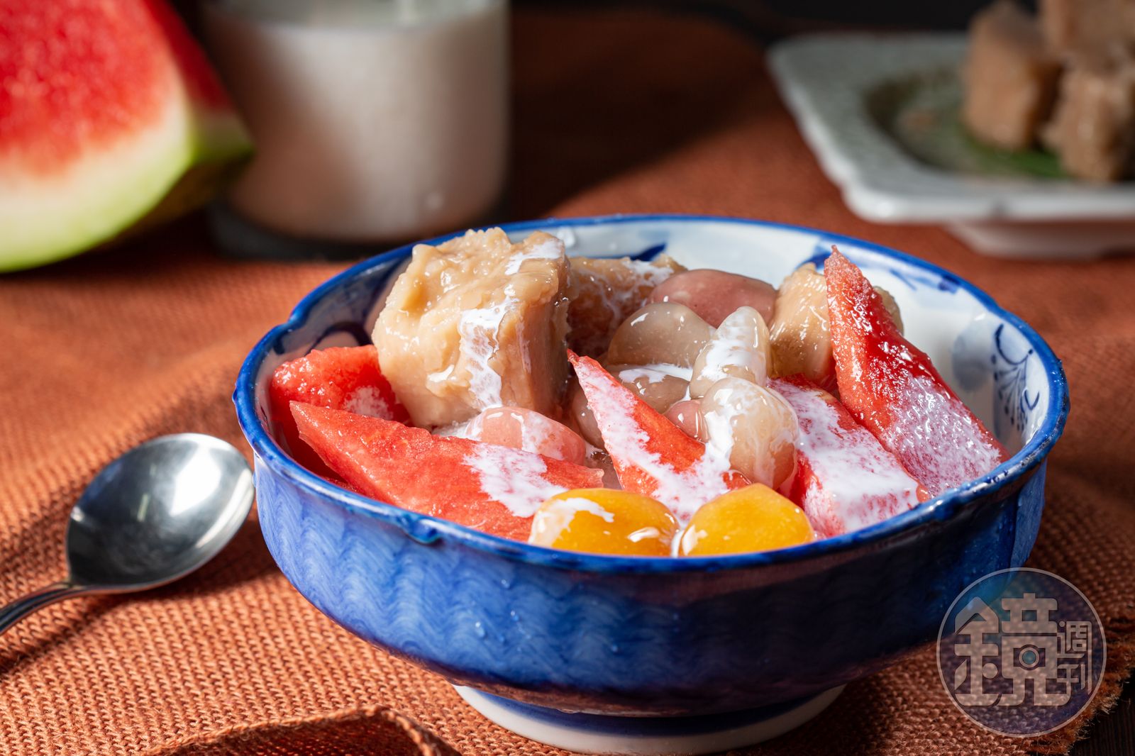 「鮮奶西瓜芋圓芋頭」看起來很衝突,冰涼的牛奶卻統合了芋圓的滑、西瓜的沙、芋頭的棉,吃來頗均衡。(55元/碗)發布時間:2020.07.17 09:30 臺北時間