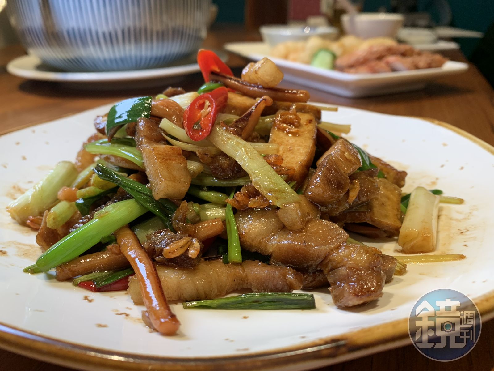 最能嘗到富美阿嬤手路的料理就是「五花魷魚小炒」。所有料一起入口,能嗅到大火爆炒的鑊氣,魷魚、蒜苗都有煸出香味,迷你的蝦米更是勾出濃鮮,配著帶皮豬五花肉絲,越嚼越香。
