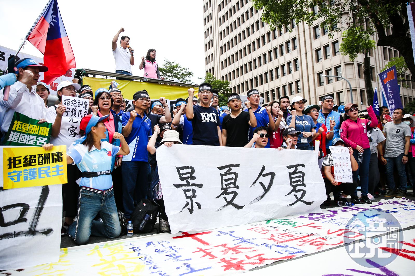 在所有人議場就定後,江啟臣隨後到場外向支持者喊話。他高喊,國民黨拒絕的不只是陳菊,更是民進黨的酬庸及貪腐,「今天如果不抗議!明天就沒有公義!」