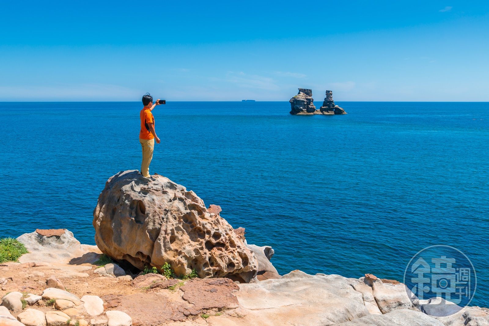 崩落的巨石矗立在海邊,由於石頭表面粗糙,有些還可試著攀爬,雖然天氣炎熱,還好有一個活水源,經人工造池蓄水後可以緩解一下暑熱,岩石經風化而產生出美麗的紋路,而幾百公尺外的盡頭,則是可近距離觀賞金山著名景點「燭台雙嶼」的絕佳地點。