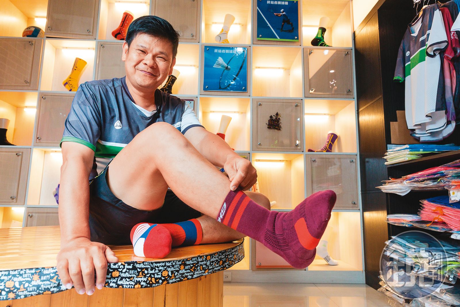 李東林拿起為台灣網球冠軍莊吉生設計的金牌網球襪,自豪地說:「網球是側向運動強度最高的,速度快又急停,所以襪子外側要用最柔軟的原料做最厚的防護,才不會摩擦破皮。莊吉生是教練帶來的,當時受傷開完刀,我幫他量身訂做襪子,他沒再受傷過,成績也上來,2017年拿到世大運金牌。」李東林能專精於運動襪領域,起因於9歲便開始打排球,「在運動襪界沒人像我這樣鑽研,因為我很喜歡運動。」