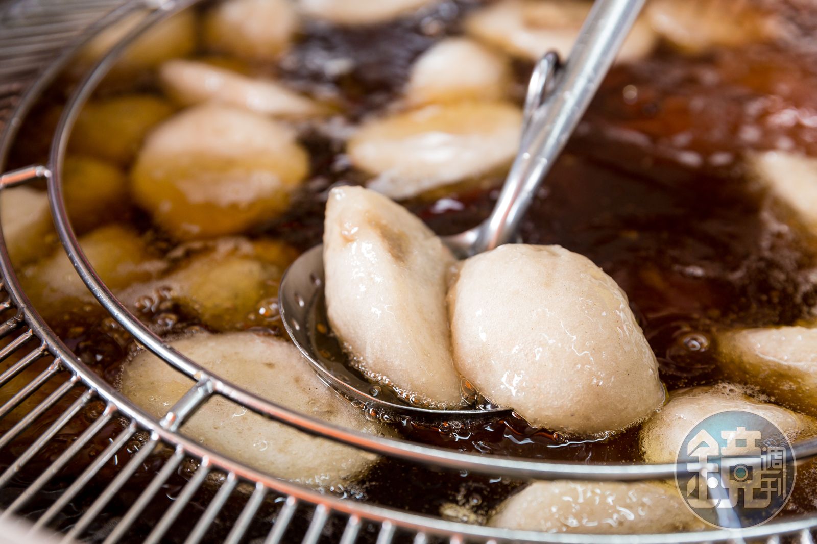 李東林最愛北斗肉圓生的肉圓裡包入筍丁,「有些店會改成大頭菜,大頭菜1公斤3塊,筍子是30塊,吃起來口感就是不一樣,筍子比較脆。」肉圓外皮則以在來米磨成漿,加蕃薯粉製作,先蒸再炸,老闆范振森特別強調,「我們用中低溫油炸,不是要炸酥,是要讓肉圓Q。」
