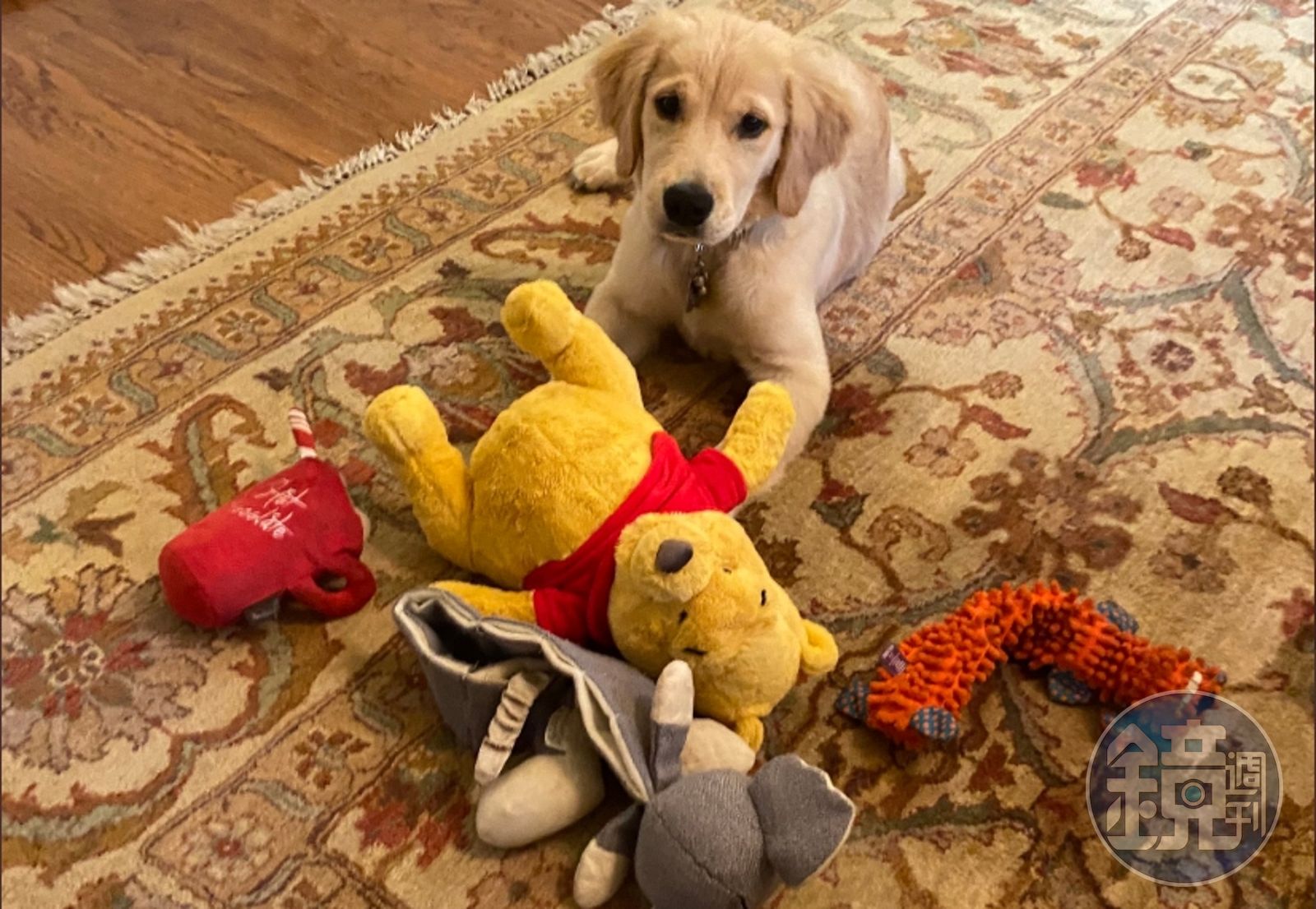 照片中蓬佩奧的愛犬坐在地上,前方放著一隻小熊維尼,與另一隻看起來像大象的玩偶,他在推文中附註「Mercer和牠最愛的玩具」。