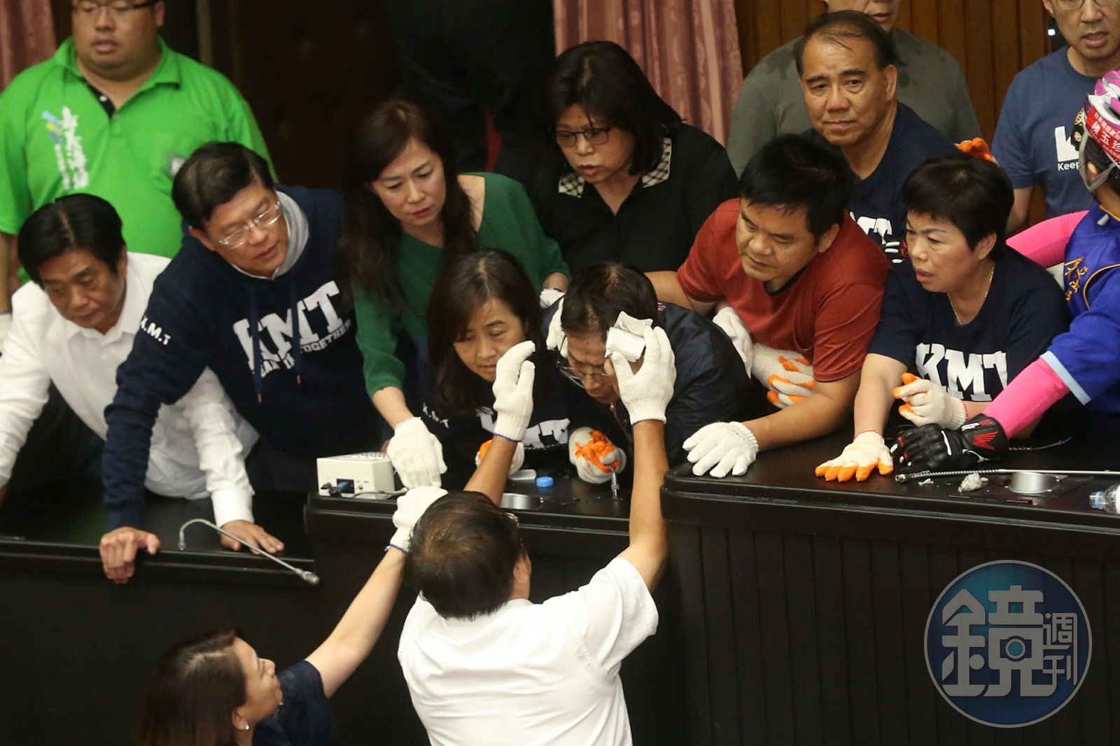 民進黨立委為了順利進行監院人事同意權投票,今日下午3點多湧入議場,將占領主席台癱瘓議事的國民黨立委「強力清場」,而藍委們則是抱緊主席台桌子,堅決不肯放手。
