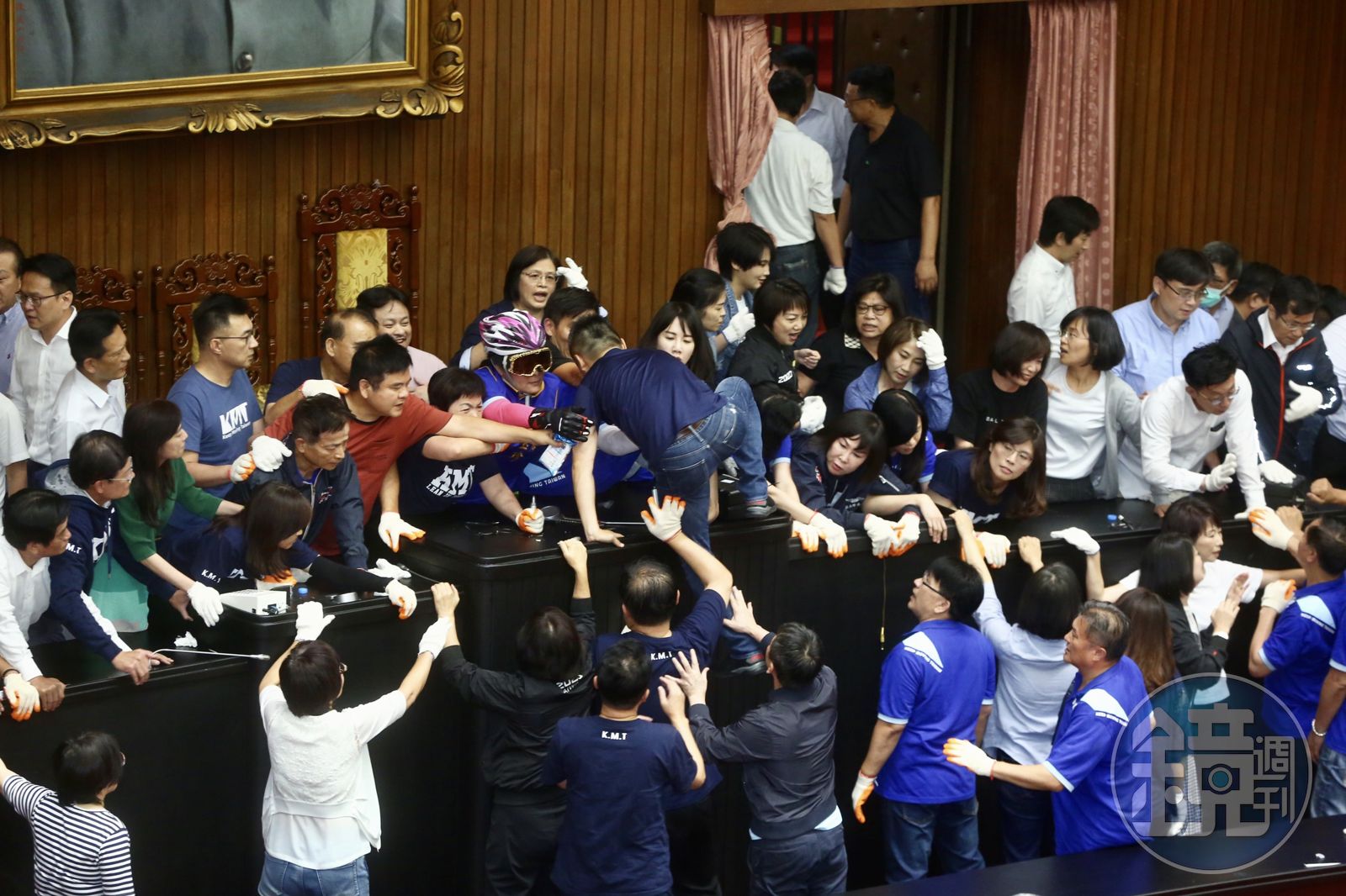 立法院臨時會明(17日)將進行監察院人事同意權投票,為反對前總統府祕書長陳菊接任監察院長,國民黨發動占領議場多日,但就在今(16日)下午,多位民進黨立委突然進攻主席台,意圖強行排除在台上的國民黨立委,雙方接著爆發激烈肢體衝突。混亂當中,國民黨立委賴士葆的頭遭椅子砸傷濺血,另一藍委鄭麗文則狂吐。