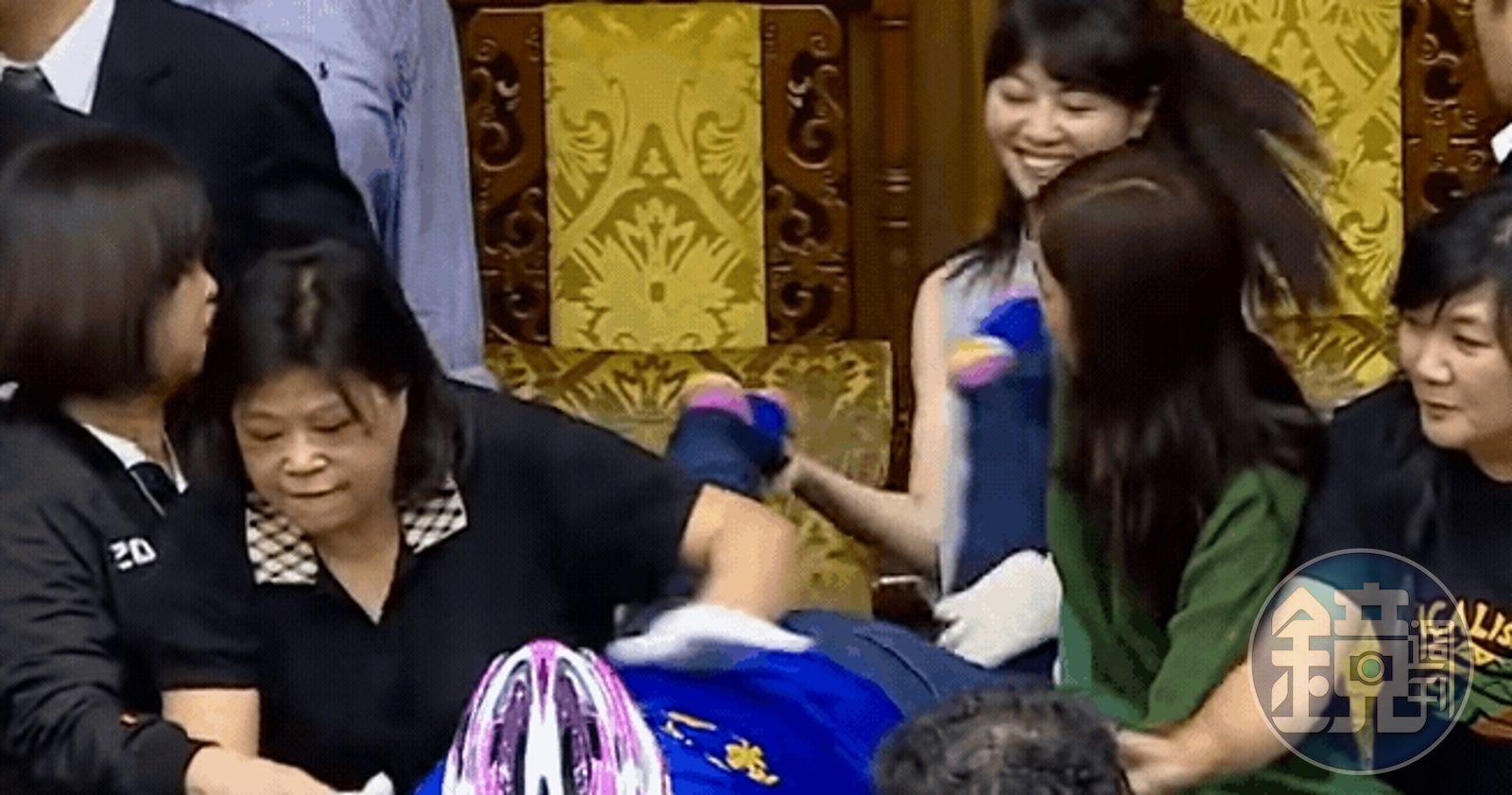 陳玉珍死守主席台的過程,便被鏡頭捕抓到高嘉瑜在陳玉珍身後,抓住她的兩隻腳晃來晃去,還露出燦爛的笑容,畫面還被網友截成動圖,認為高嘉瑜在「玩」陳玉珍的腳。最後疑似高嘉瑜抓不住陳玉珍的腳,在一次亂踢中直接擊中王美惠的面部,讓王當場爆氣捶打陳的背部,兩人在柯建銘等人的緩和下才稍微分開。
