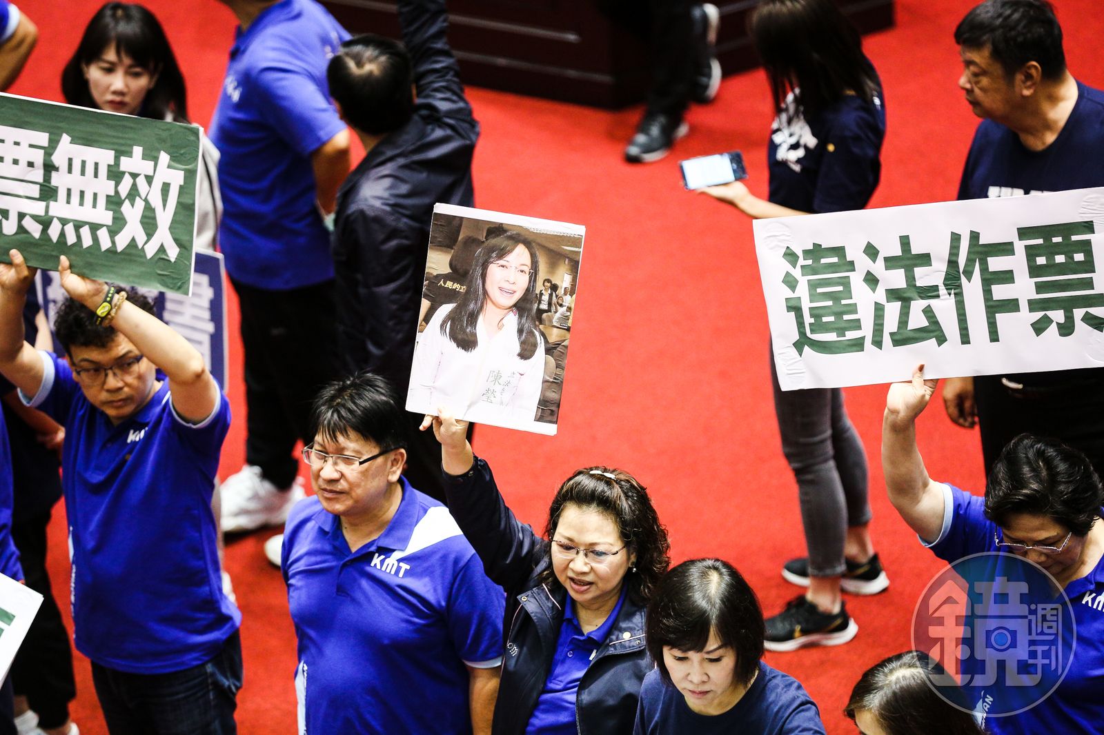 投票開始前,國民黨團總召林為洲帶領黨籍立委在議場前召開記者會。他指名,昨日的全院委員會審查有瑕疵,因爲民進黨立委陳瑩當時根本不在現場,「跑去上三立節目了!但卻有人冒名幫她投票!審查無效!所以今天不得投票!」