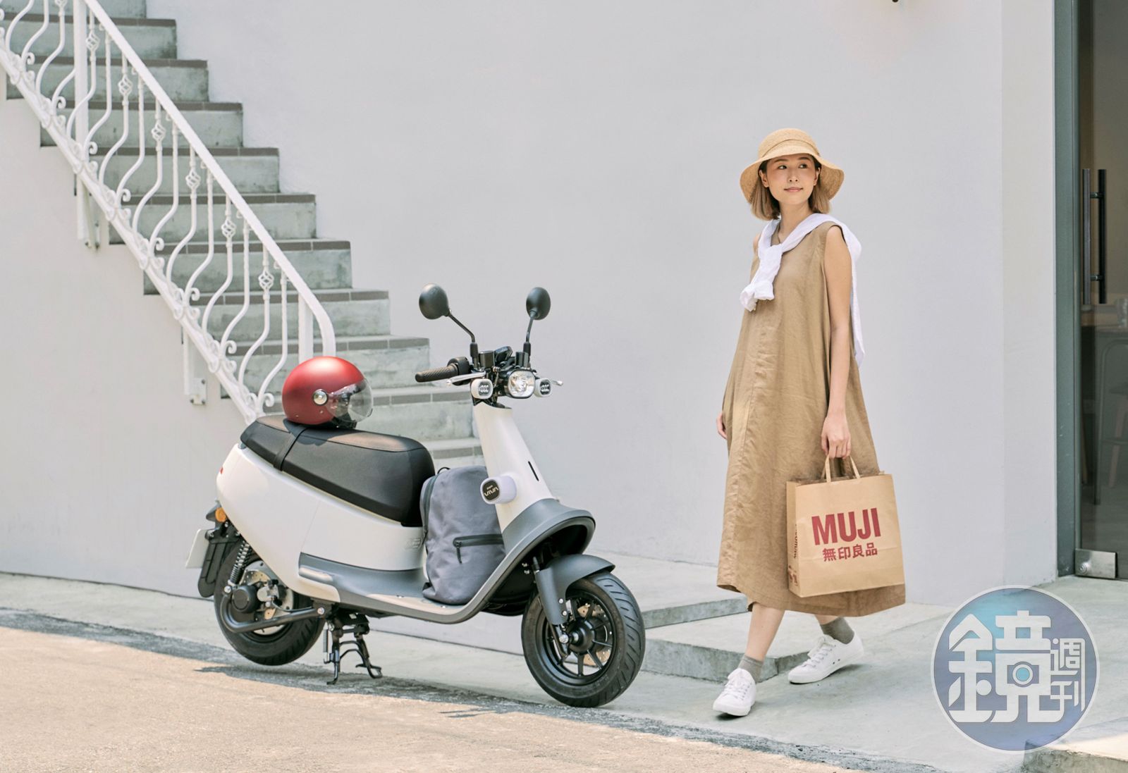 儀表板上的 GO 鍵,選用經典的「無印紅」。隨車附贈的 Gogoro 安全帽,採用相同的無印紅色作為呼應,更以低調的消光霧面設計,結合車殼霧面的素樸質感,和車身完美搭配!車頭使用淺灰方向燈套,與膠囊造型頭燈完美搭配,展現騎乘最基本的樣貌;而車尾一樣採低調純粹的車尾標誌,呼應 MUJI 無印良品簡約的品牌美學,展現簡單的生活美感。