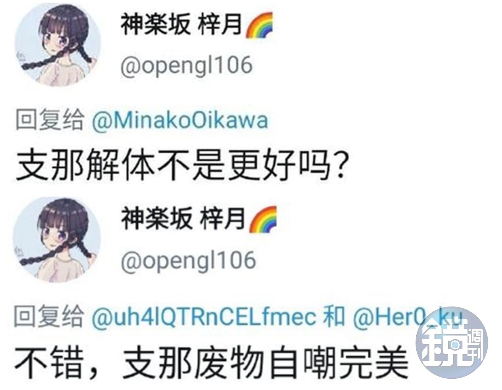 季生今年1月13日寒假期間赴美,遇疫情滯留未返,期間遵照校方要求進行遠距課程,直到7月8日才從中國成都入境。她遭截圖檢舉,在今年3月至6月滯美期間,以Twitter帳號「神樂坂 梓月」多次發表跟南京大屠殺相關言論,被網友砲轟「精日」美化日本,並多次發文蔑稱中國為「支那」。