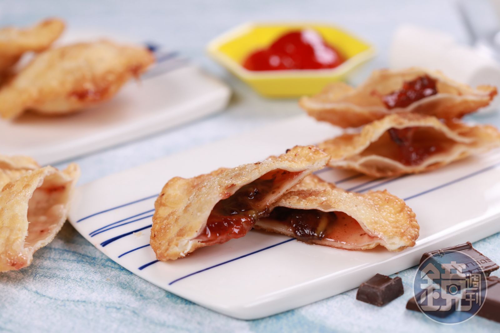 打頭陣的是一道finger food,我叫它「阿莓仔夾派」,主要原料是水餃皮夾著草莓醬,包進冰箱裡的巧克力、起司、棉花糖等剩料,下鍋炸成草莓派,故名「夾派」,而且熱騰騰吃進嘴裡,外酥內爆漿,感覺脾氣很差,也呼應了台語的「真歹(很凶)」,是道個性有如撿到槍的小前菜。