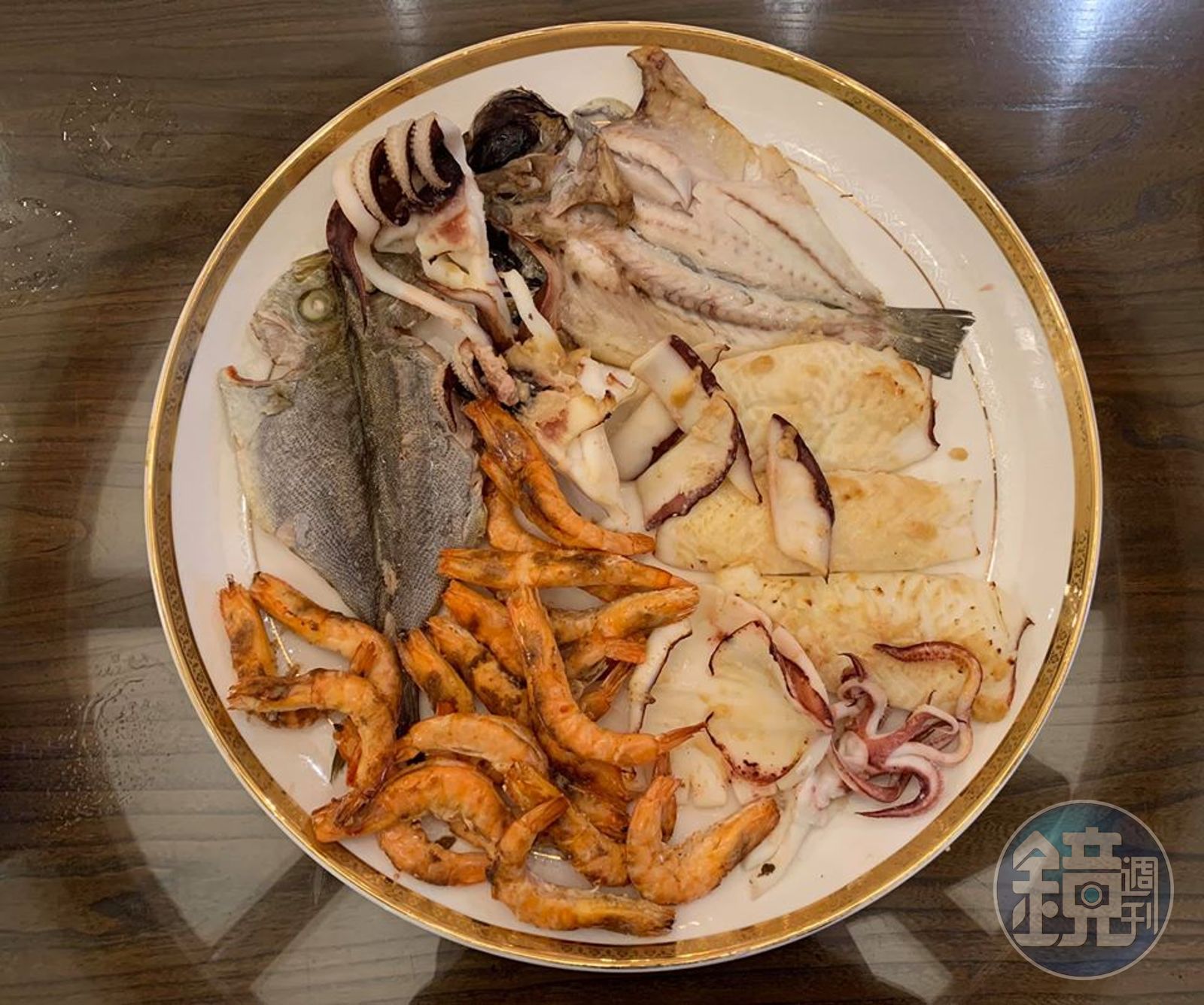 材料:黑喉一夜干1尾、黃雞魚一夜干1尾(魚鋪已對半切開,醃好,不需調味)、厚花枝1隻、透抽1隻、白蝦1盒。酒粕白味噌、椒鹽粉、橄欖油。