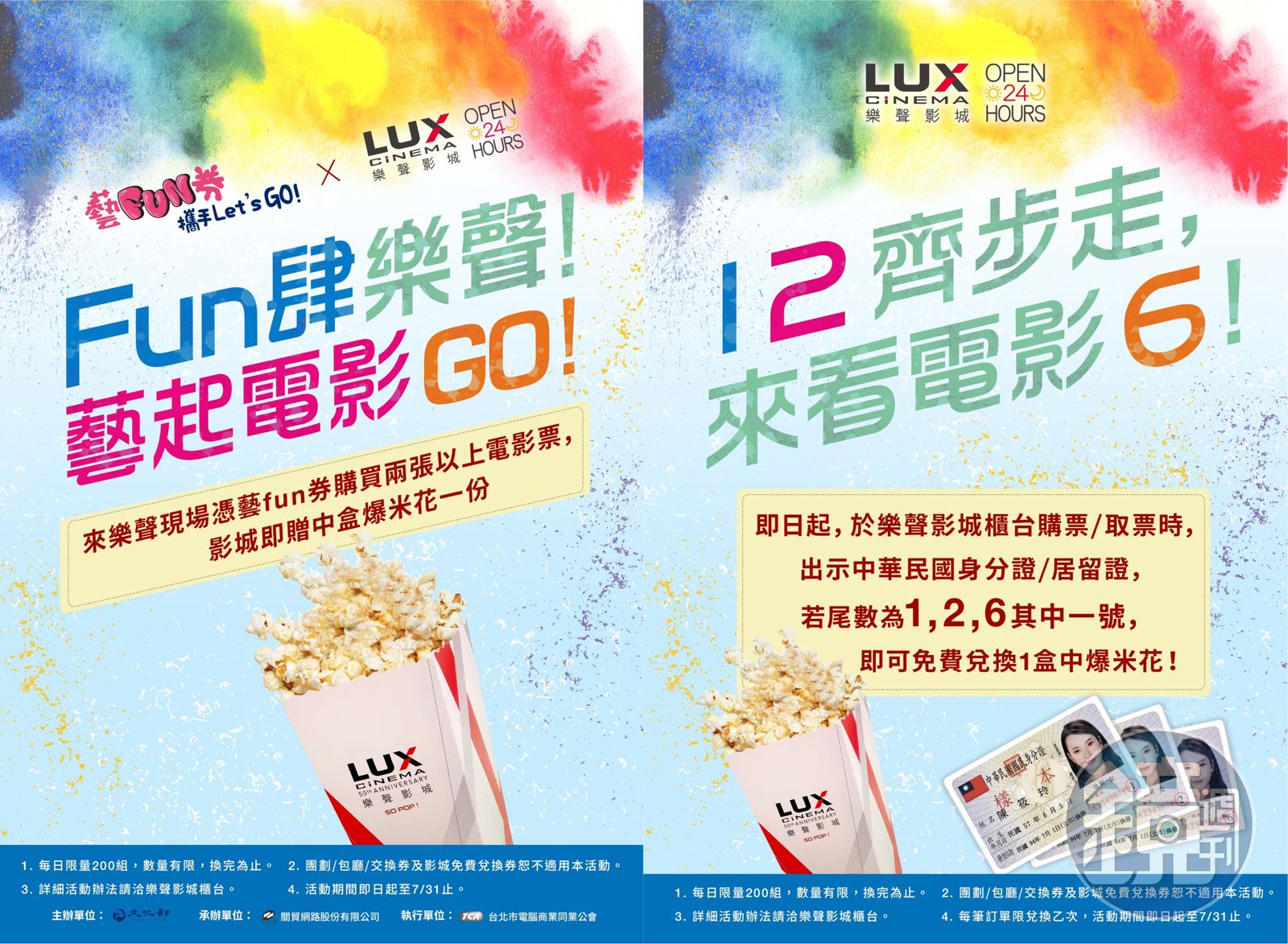 樂聲影城配合「藝Fun券」推出贈爆米花的活動。(樂聲影城提供)發布時間:2020.07.24 18:48 臺北時間