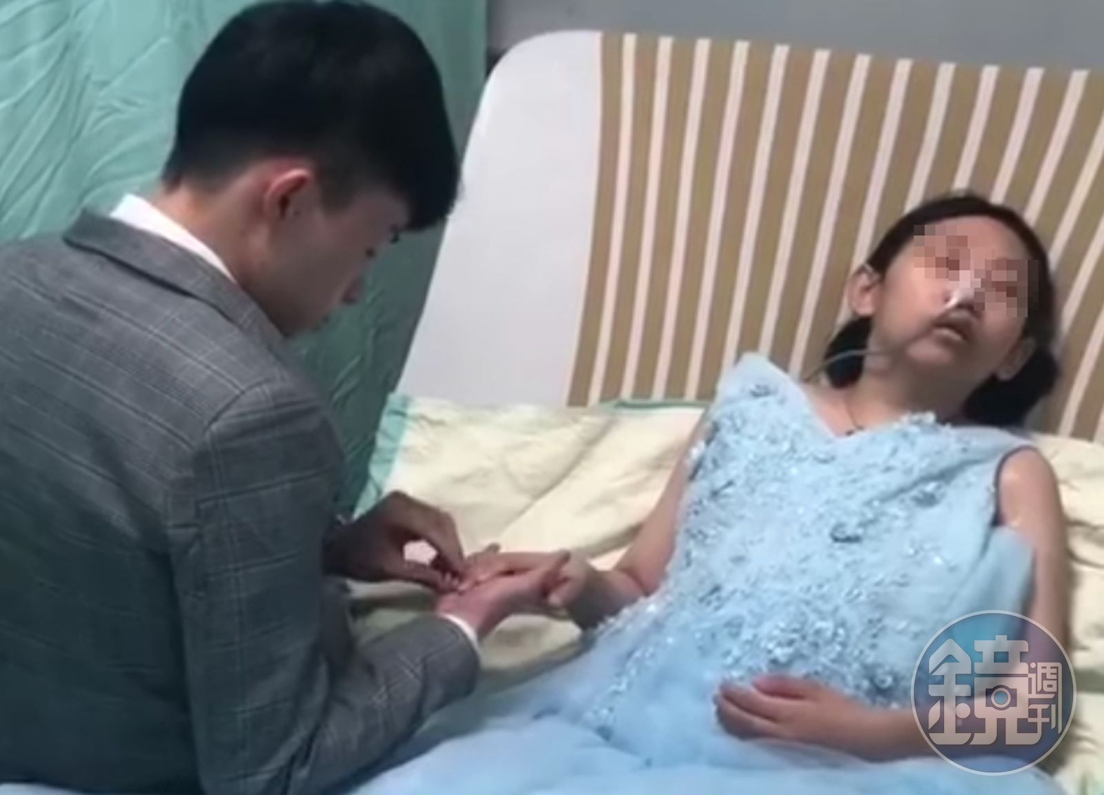 影片中看到洪女穿著淡藍色婚紗,男友則不時親吻她的額頭,並為她戴上婚戒,親友也紛紛跟洪女合影,留下紀念。根據了解,洪女從5歲就沒再看過自己的媽媽,發現自己罹癌後,因為渴望家庭的溫暖,所以放棄治療想為男友生一個孩子,但6個月大時卻不幸胎死腹中,如今癌末的她在林口長庚醫院,希望可以在臨終前再見到媽媽一面。