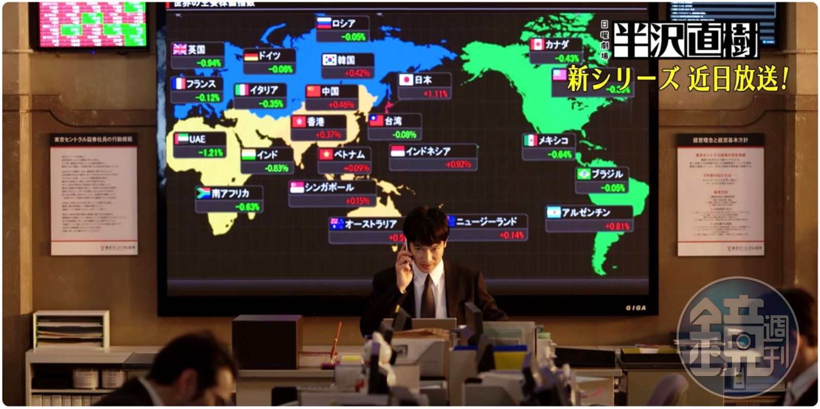 有眼尖網友發現《半澤直樹2》重播時,國旗全都消失了。(翻攝PTT)昨(26)日《半澤直樹2》重播第一集,但原本半澤直樹後面顯示股市跌幅的電子螢幕上的各國國旗全都消失,電視台可能為了避免爭議才做出此舉。