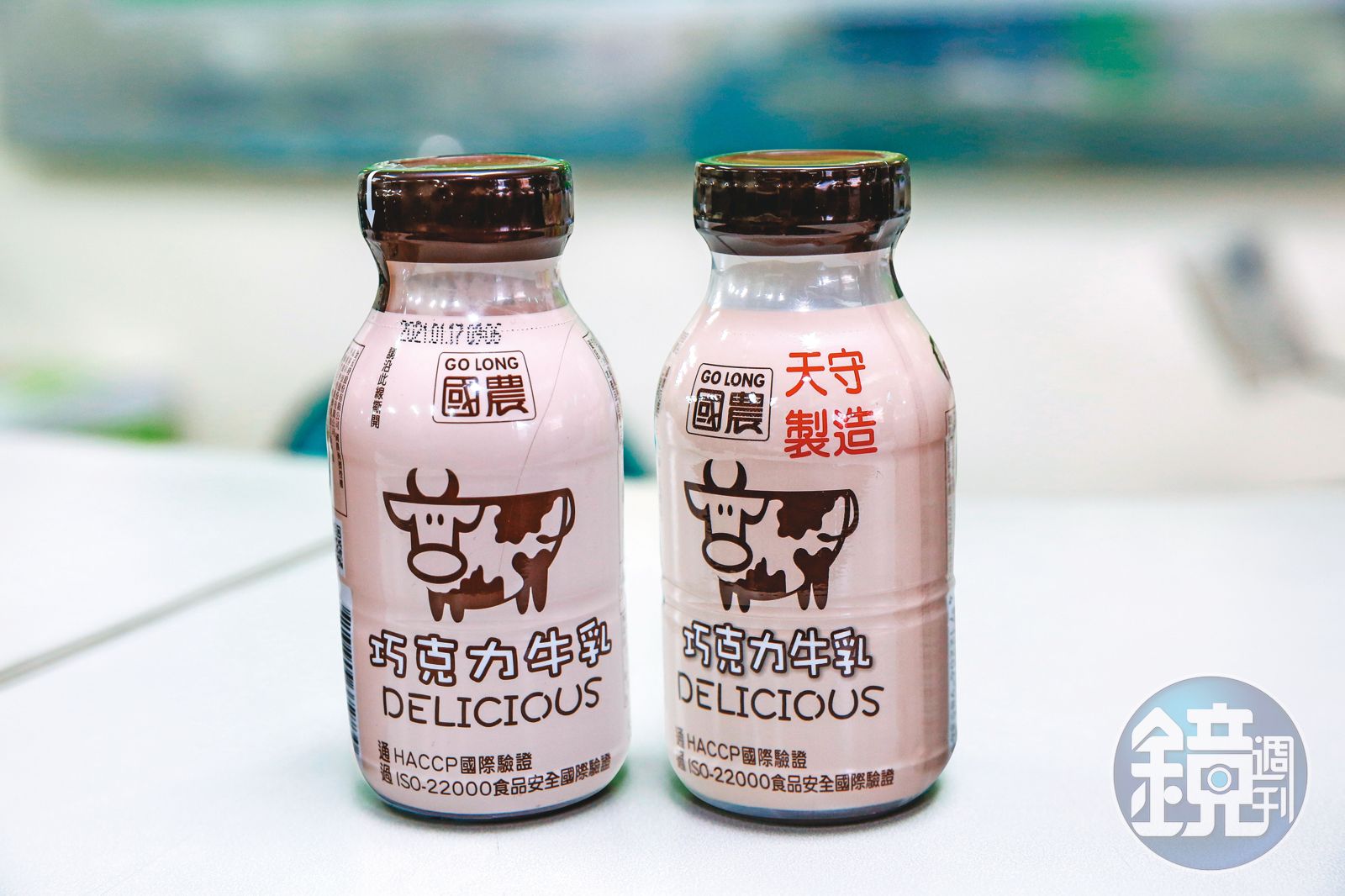 銷售近40年的國農牛乳,是許多民眾兒時記憶的好味道。未料,近期市面上卻出現二家不同工廠製造、包裝相似的商品,一款在瓶身上標明「天守製造」,另一款上頭也寫著國農,但包裝上寫著出品公司卻是萬喜,讓消費者傻傻分不清。