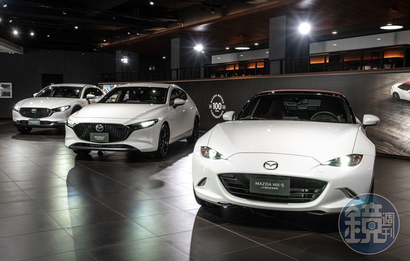 百週年紀念車款共推出五門Mazda3、CX-30、MX-5與MX-5 RF四種車款,售價分別為102.9萬、112.9萬、139萬與156萬;全車系的設計靈感源自於品牌首款四輪乘用車R360 Coupe,利用雪白外觀車色搭配酒紅色的內裝,向深具歷史定位的R360 Coupe致敬,車身與內裝等多處細節也融入了專屬一百週年紀念的特殊徽飾,像是位於葉子板上1920-2020的字樣,輪圈蓋也利用創場百年的紀念徽章取代原本的廠徽,內裝則多處烙印上場百週年的廠徽,車鑰匙也與眾不同,在每個細節處凸顯紀念車的特殊。
