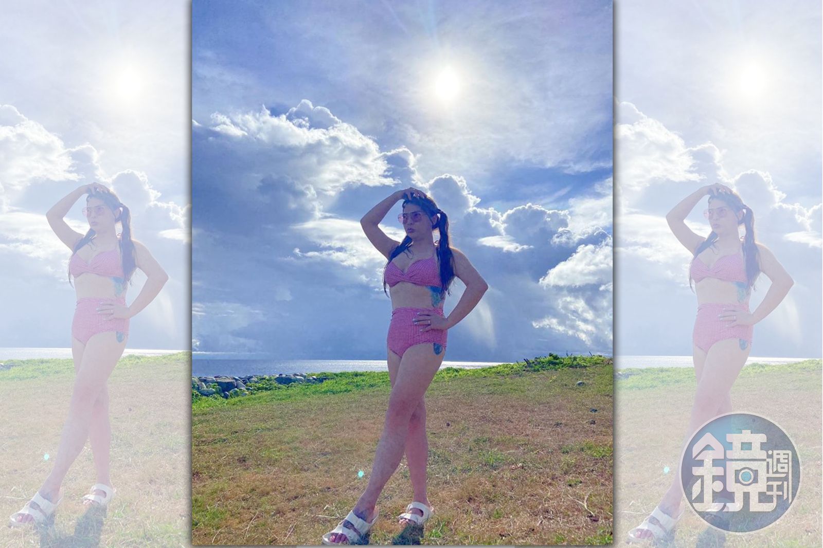 她身穿紅白格紋比基尼,露出豐滿半球,寫道「謝謝在綠島相遇的每個熱情的民眾商家,希望我跟大家巧遇的合照不要太醜太狼狽,我實在太入境隨俗了,在綠島整個好chill超隨性…舒服。」